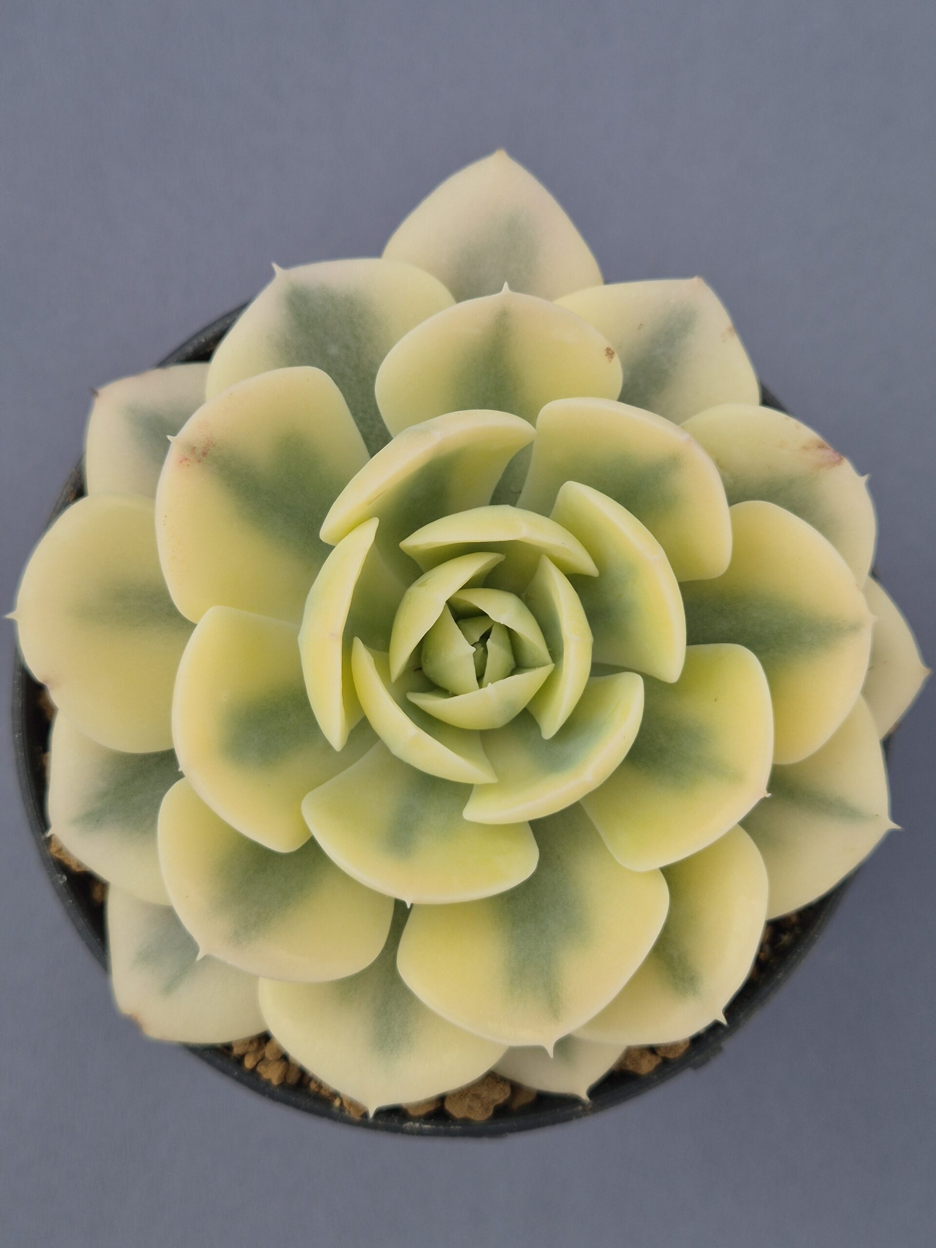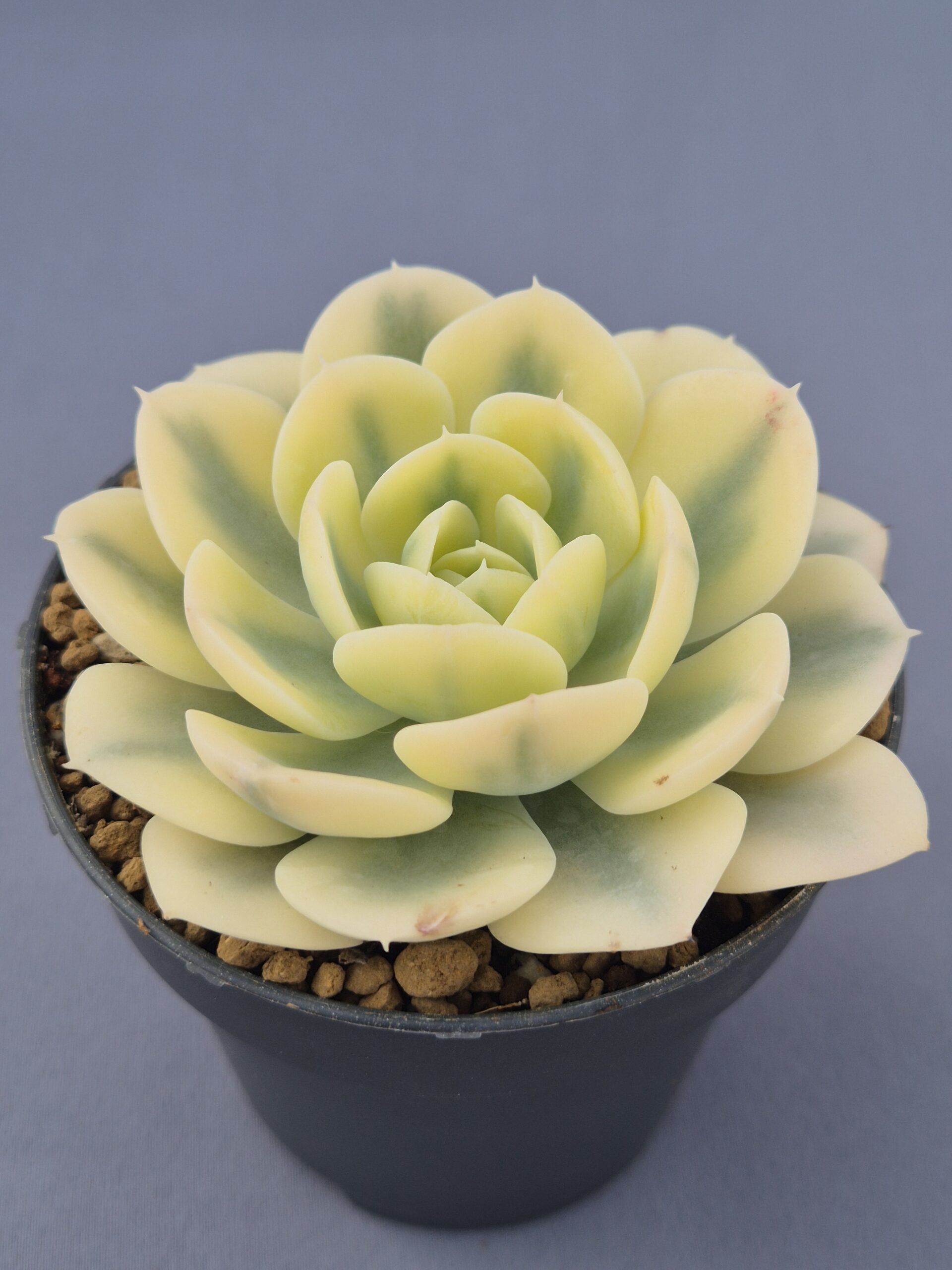 Echeveria runyonii variegada es una suculenta muy apreciada por su variegación estable y su roseta perfectamente ordenada, que combina tonos suaves y luminosos. Destaca por su aspecto limpio y elegante, ideal para colecciones de variedades variegadas.