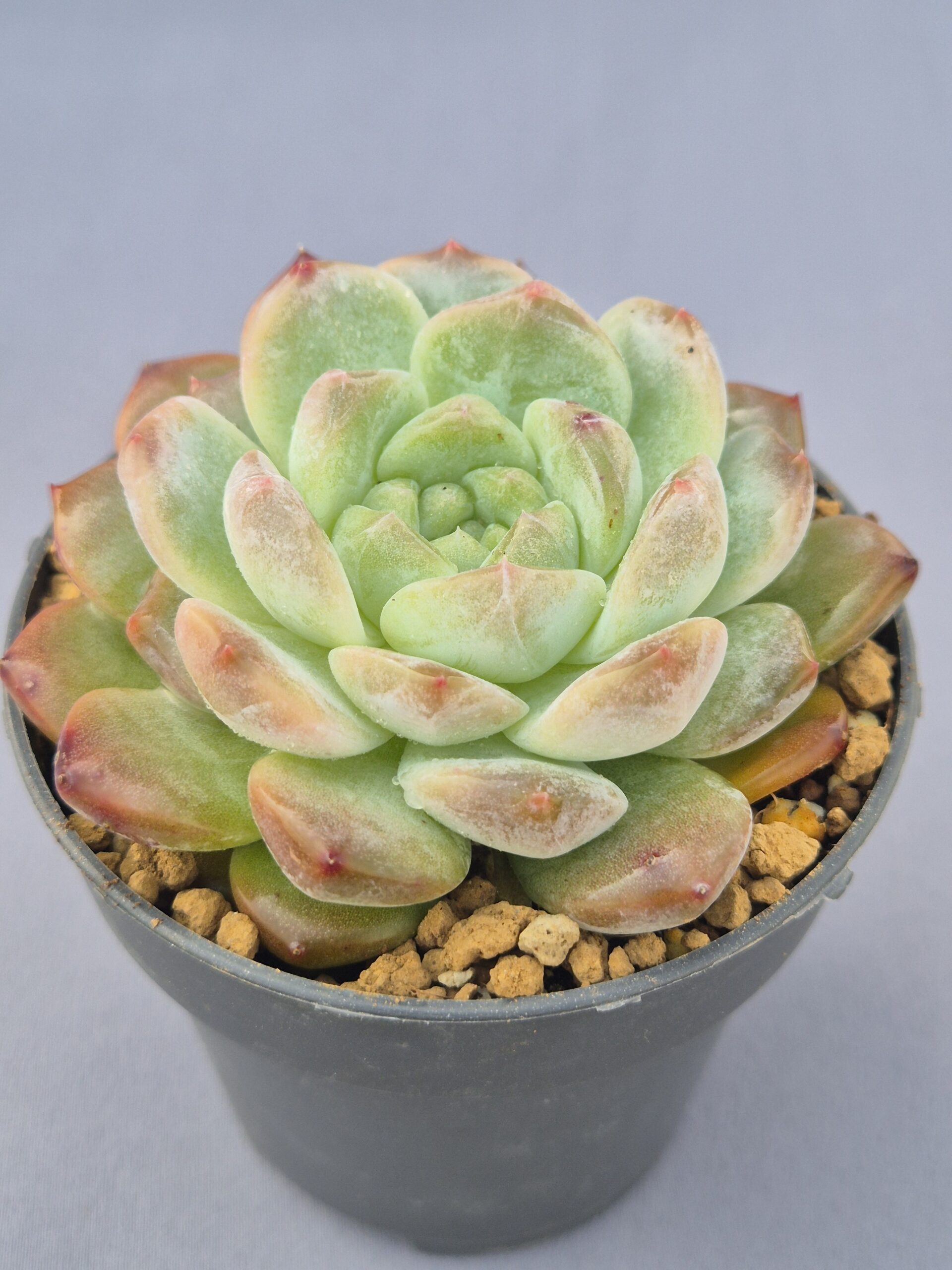 Echeveria ‘Snow Tower’ es una suculenta de aspecto compacto y delicado, reconocida por su roseta bien estructurada y su combinación de tonos suaves que le aportan una presencia elegante y equilibrada. Es una variedad muy apreciada por su estabilidad de forma y su atractivo visual durante todo el año.
