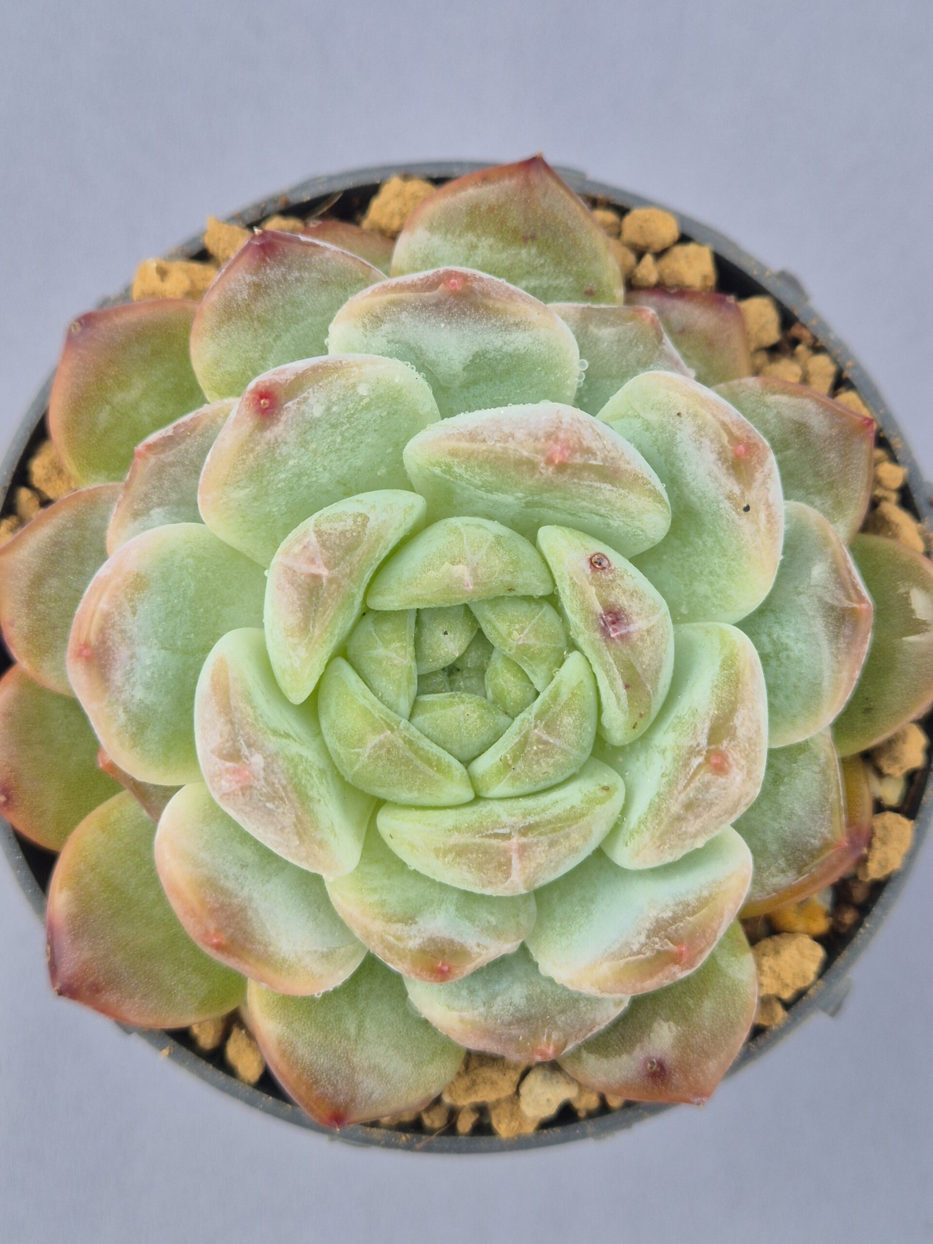 🎨Color: Predomina el verde claro a verde manzana, con matices blanquecinos debido a la pruina. Los bordes y ápices presentan suaves toques rosados o salmón, más intensos con buena exposición a la luz.