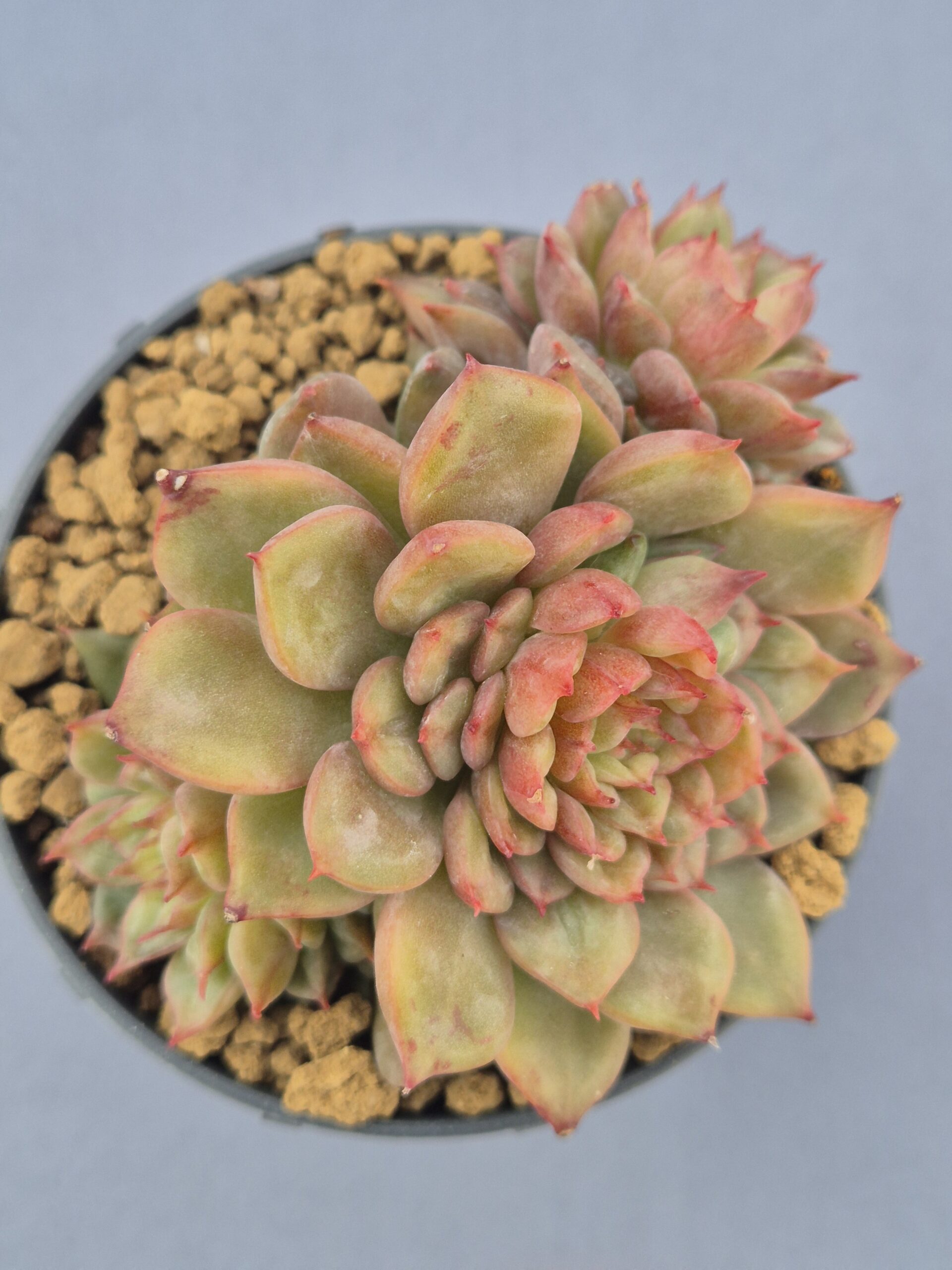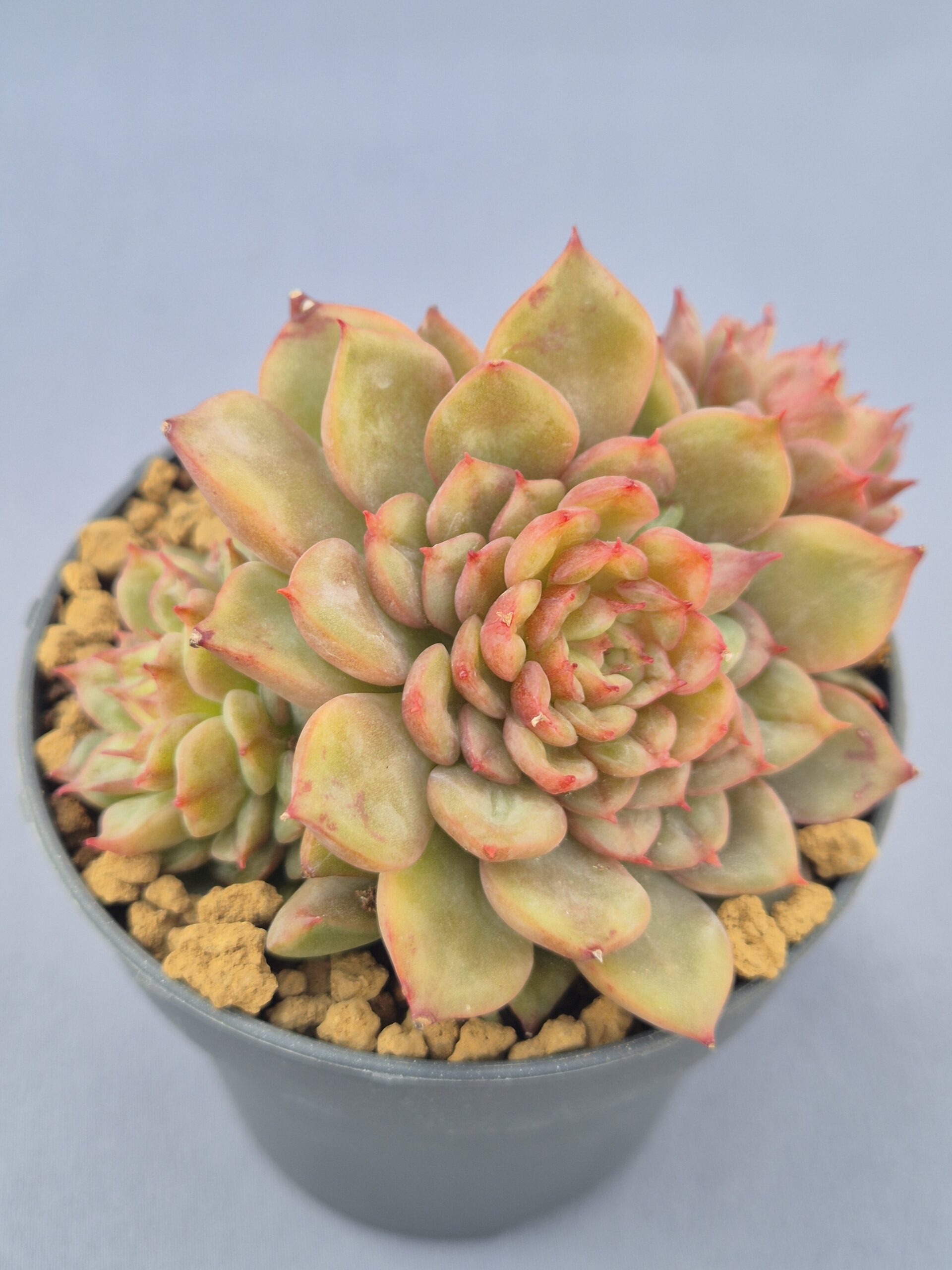 🌿Hojas gruesas, ligeramente puntiagudas y bien dispuestas en forma de roseta. Tiende a formar hijuelos con facilidad, ideal para multiplicar.