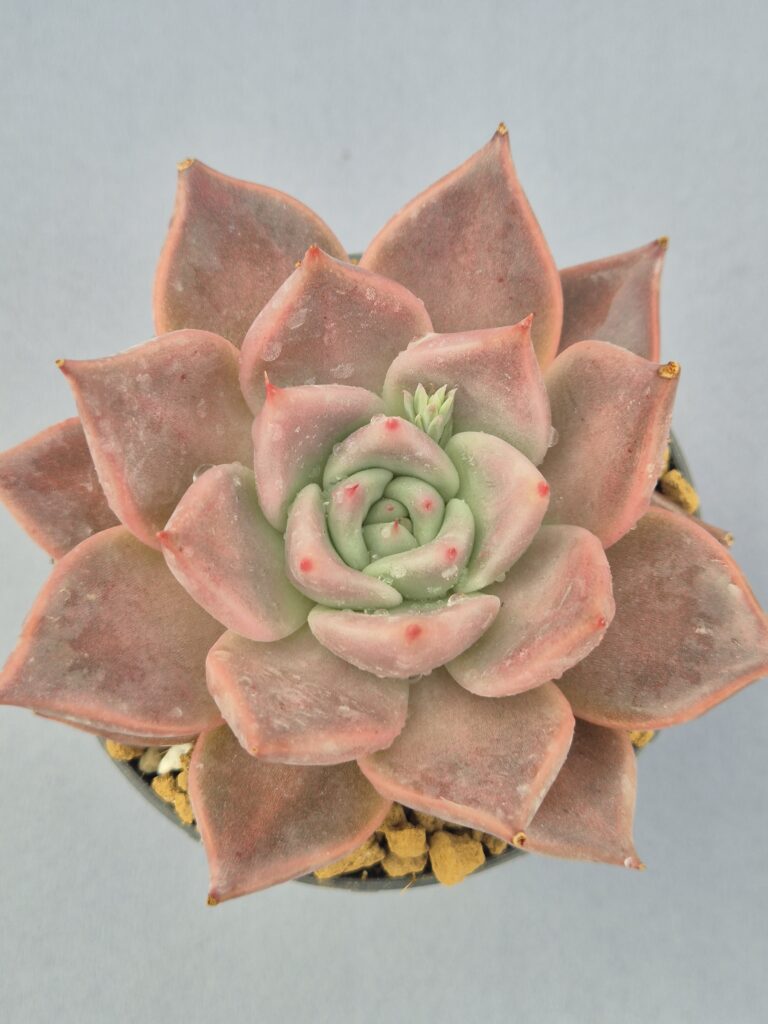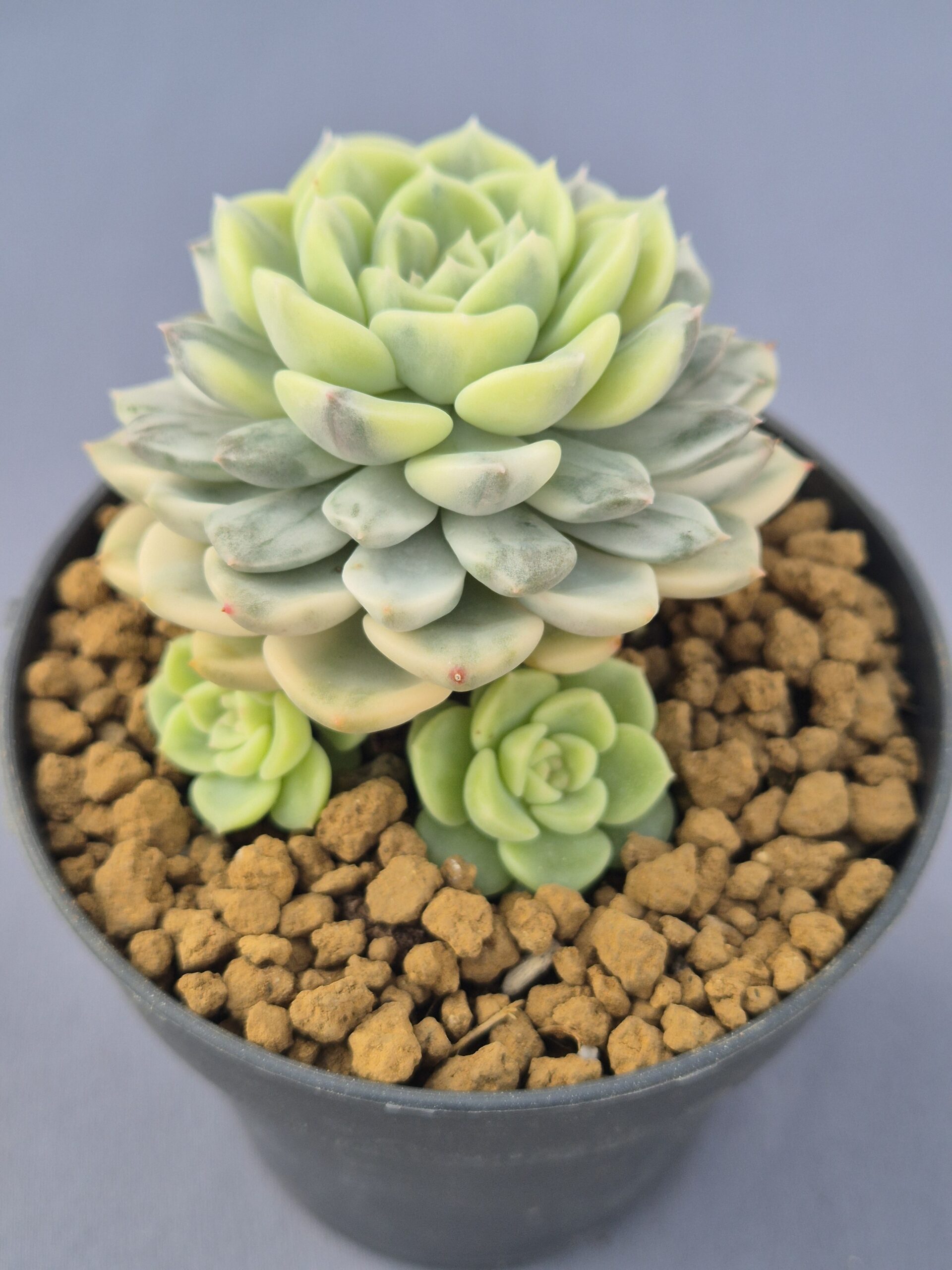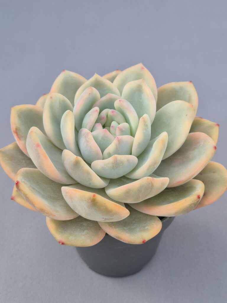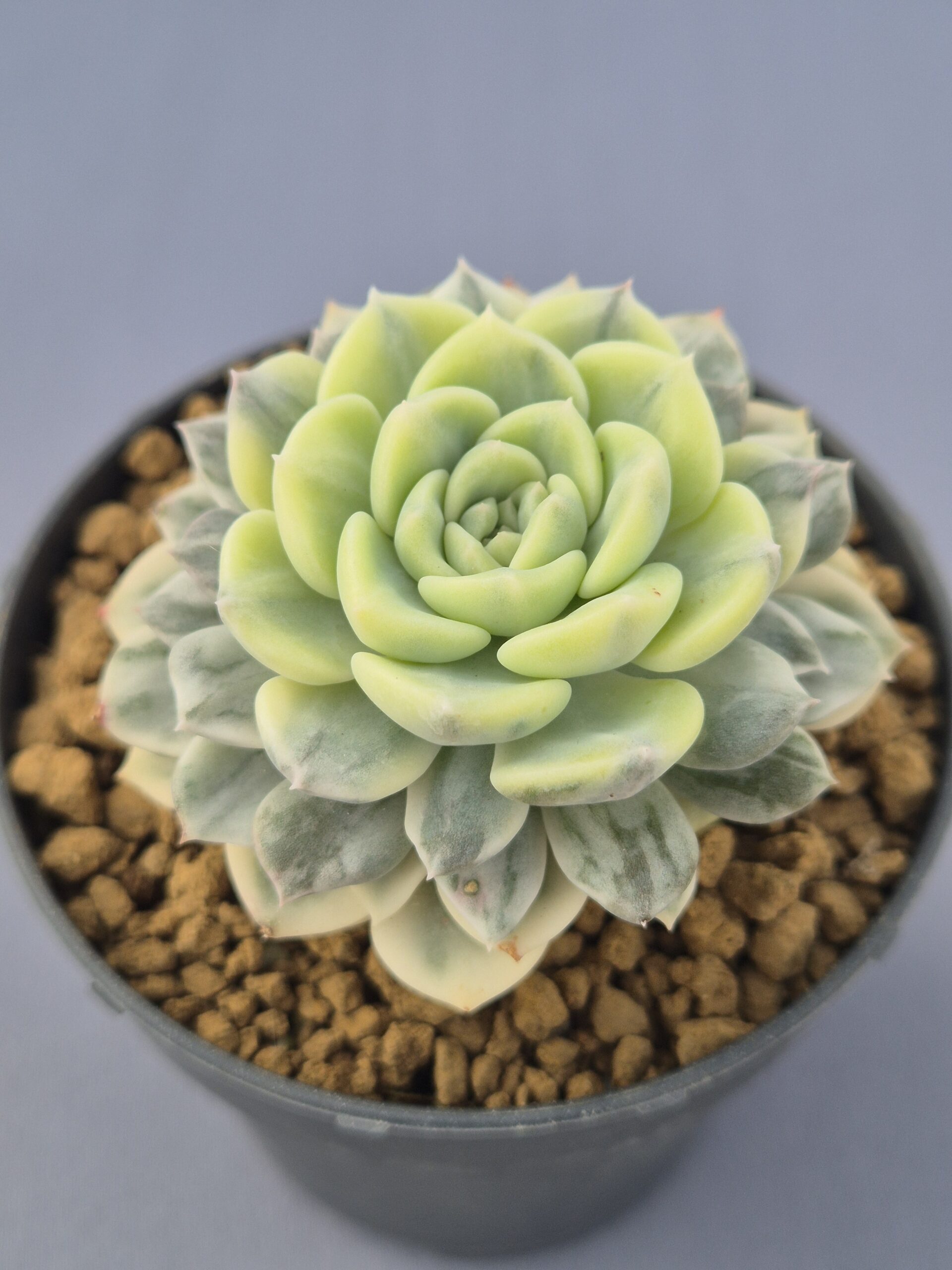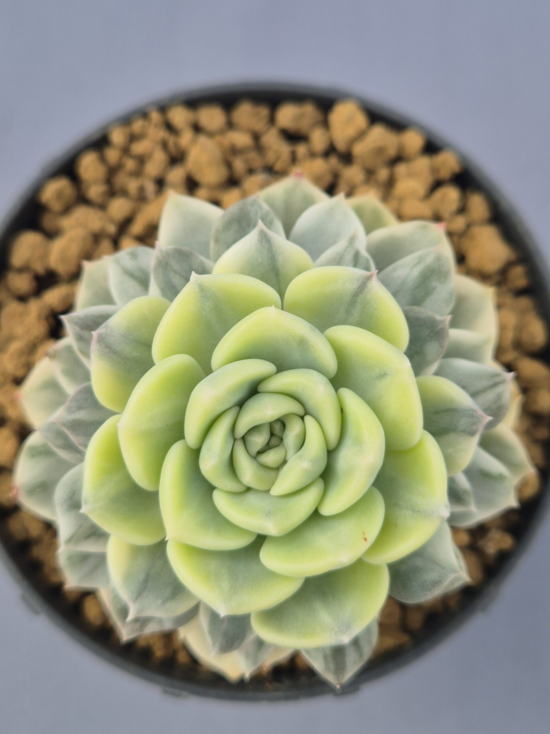 La Echeveria Tinkerbell es una suculenta de gran delicadeza estética, caracterizada por su roseta perfectamente compacta y sus suaves tonalidades verdes con matices blanquecinos. Su apariencia limpia y equilibrada la convierte en una variedad muy apreciada tanto en colecciones botánicas como en composiciones minimalistas.