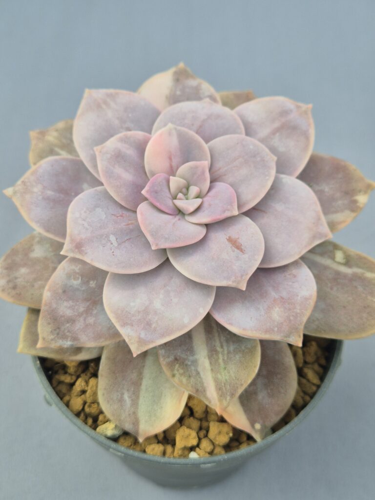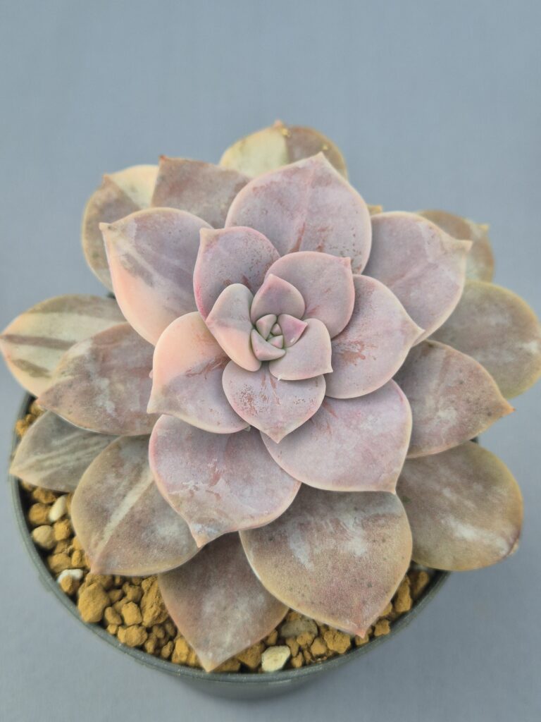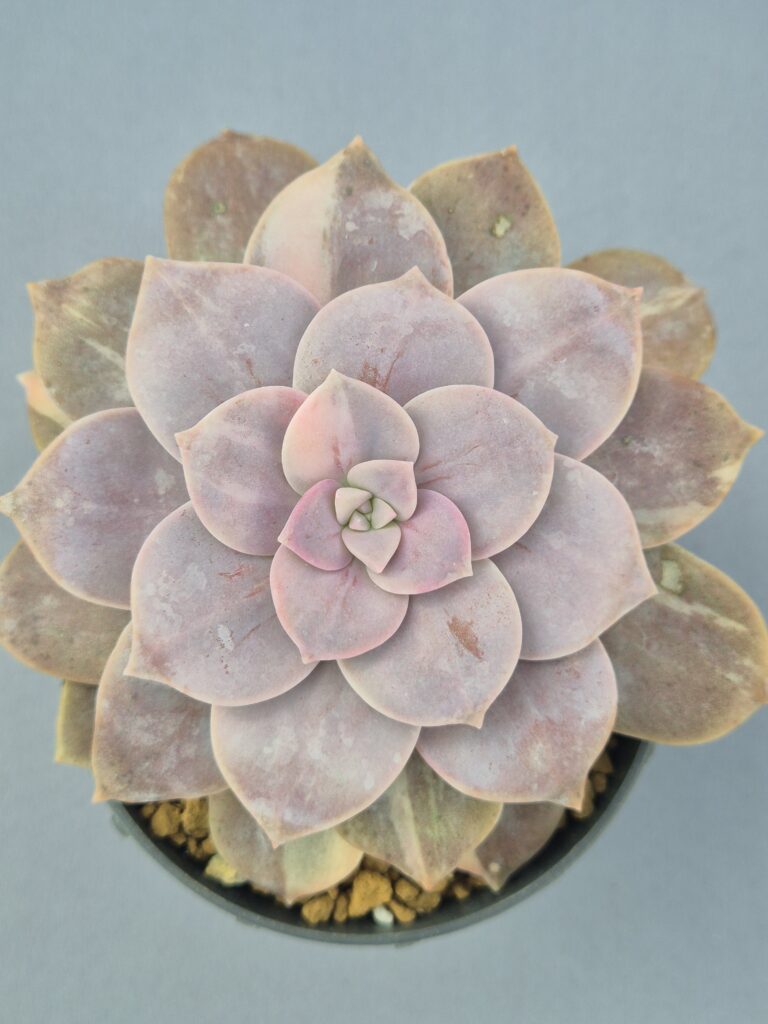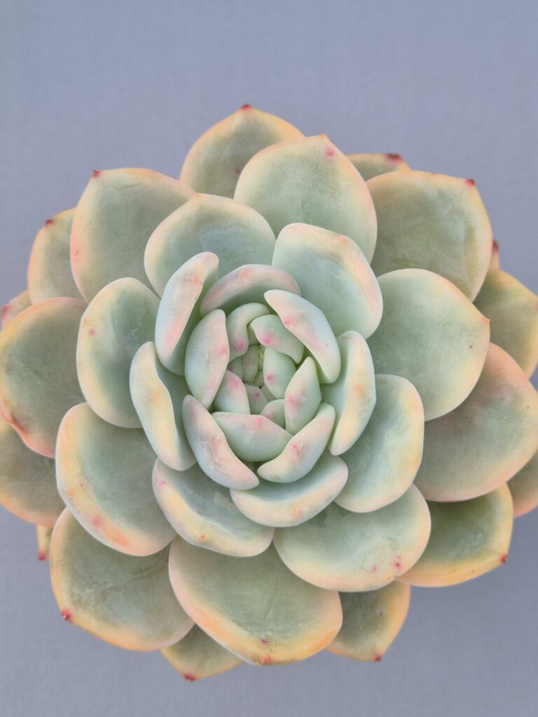 🌿Forma: Roseta muy simétrica y cerrada, con hojas carnosas, redondeadas y ligeramente superpuestas en disposición espiral.