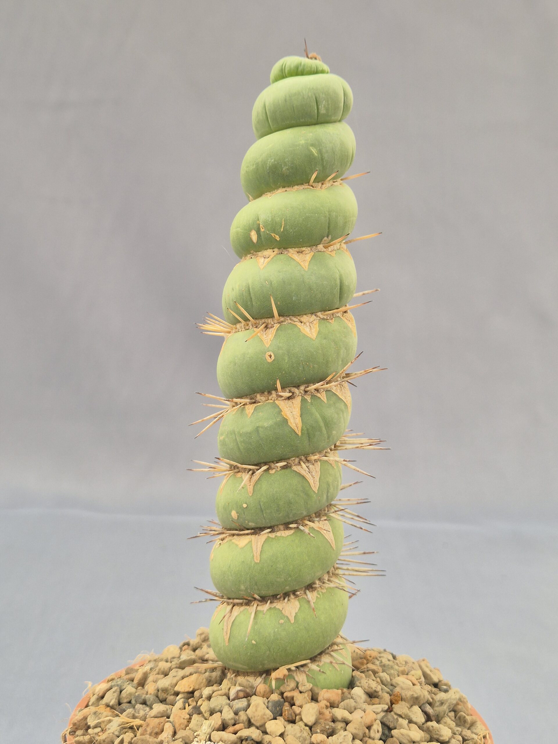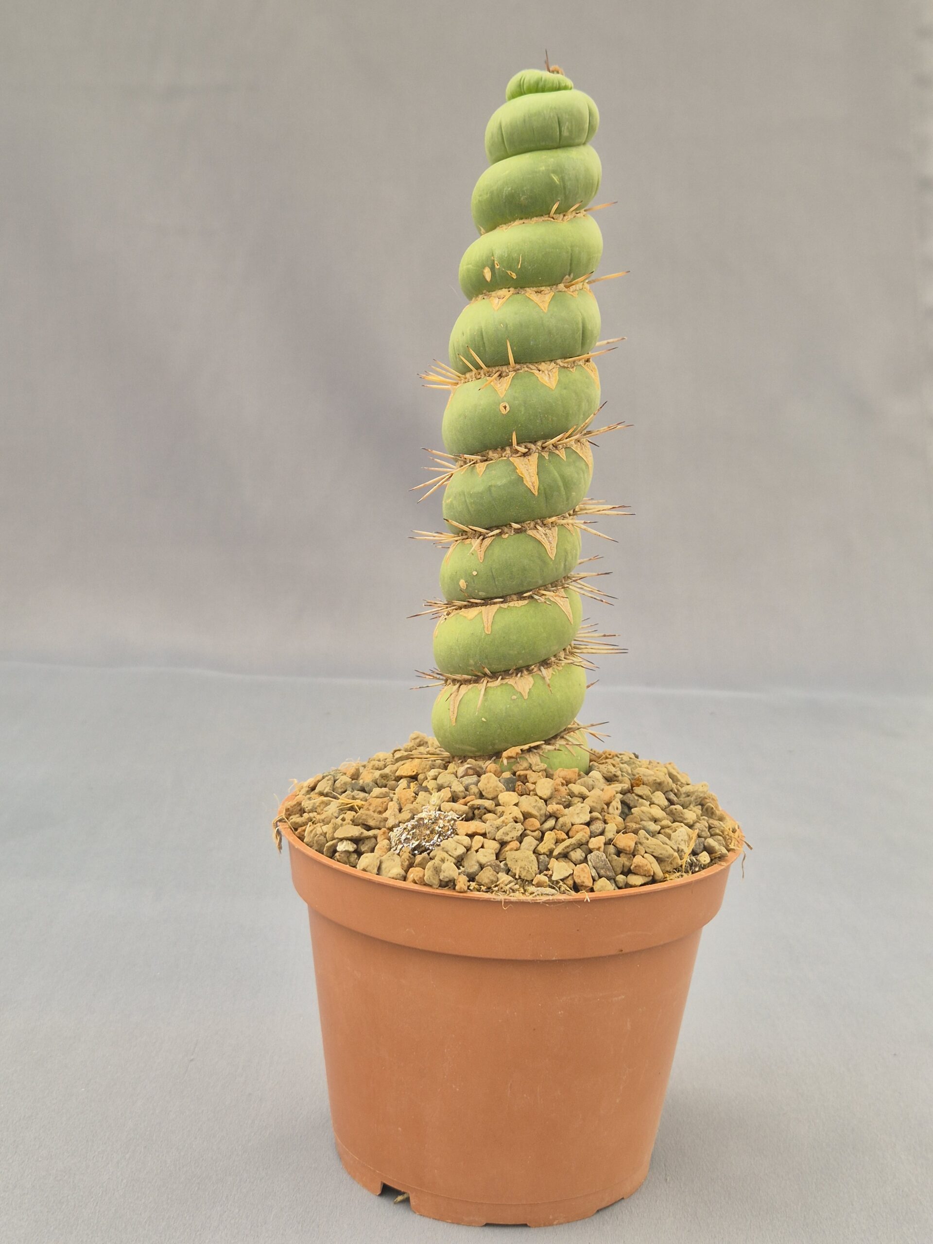 Eulychnia castanea var. spiralis es un cactus muy singular y altamente decorativo, conocido por su crecimiento en espiral que le aporta un aspecto dinámico y escultórico. Su forma retorcida lo convierte en una pieza muy valorada por coleccionistas que buscan ejemplares poco comunes y con gran presencia visual.