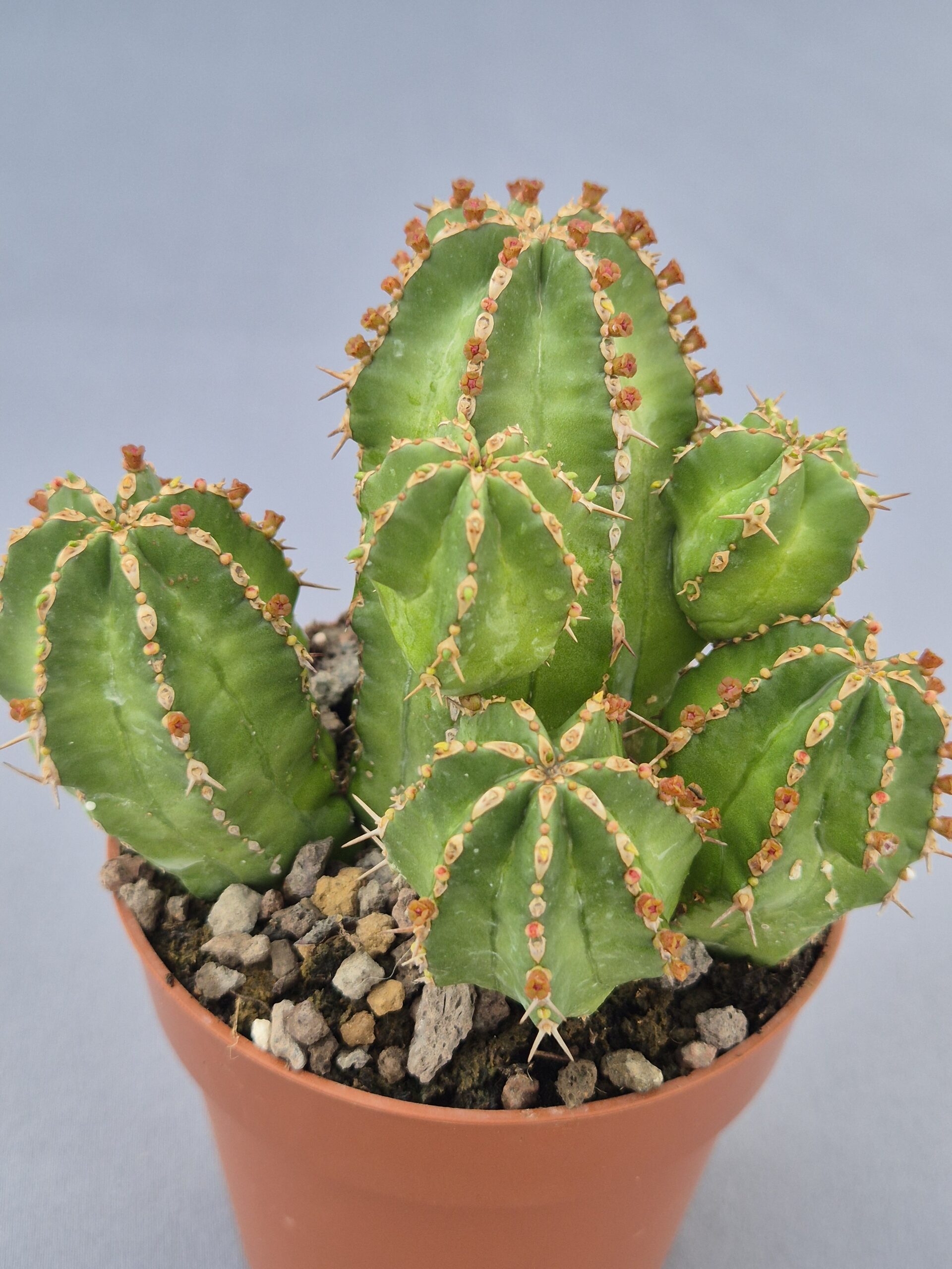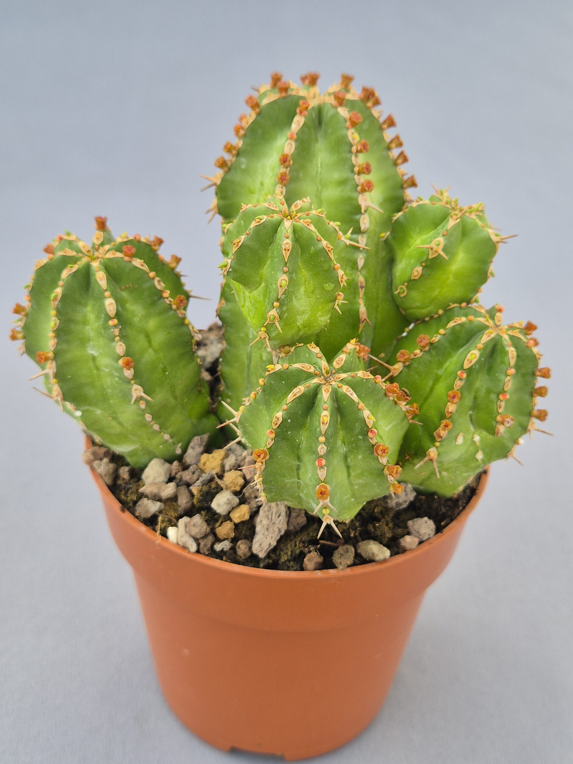 Suculenta de porte compacto y crecimiento agrupado, muy apreciada por su forma columnar y su aspecto robusto, típica del género Euphorbia y perfecta para colecciones de cactus y suculentas especiales.