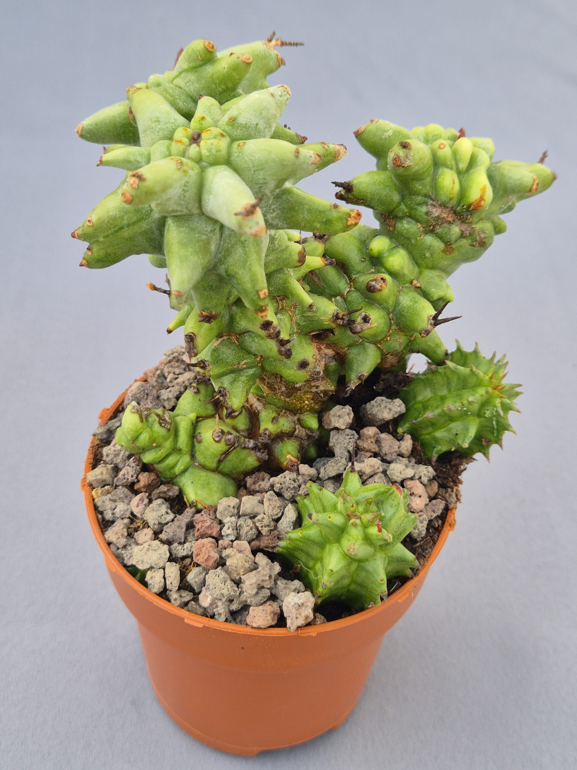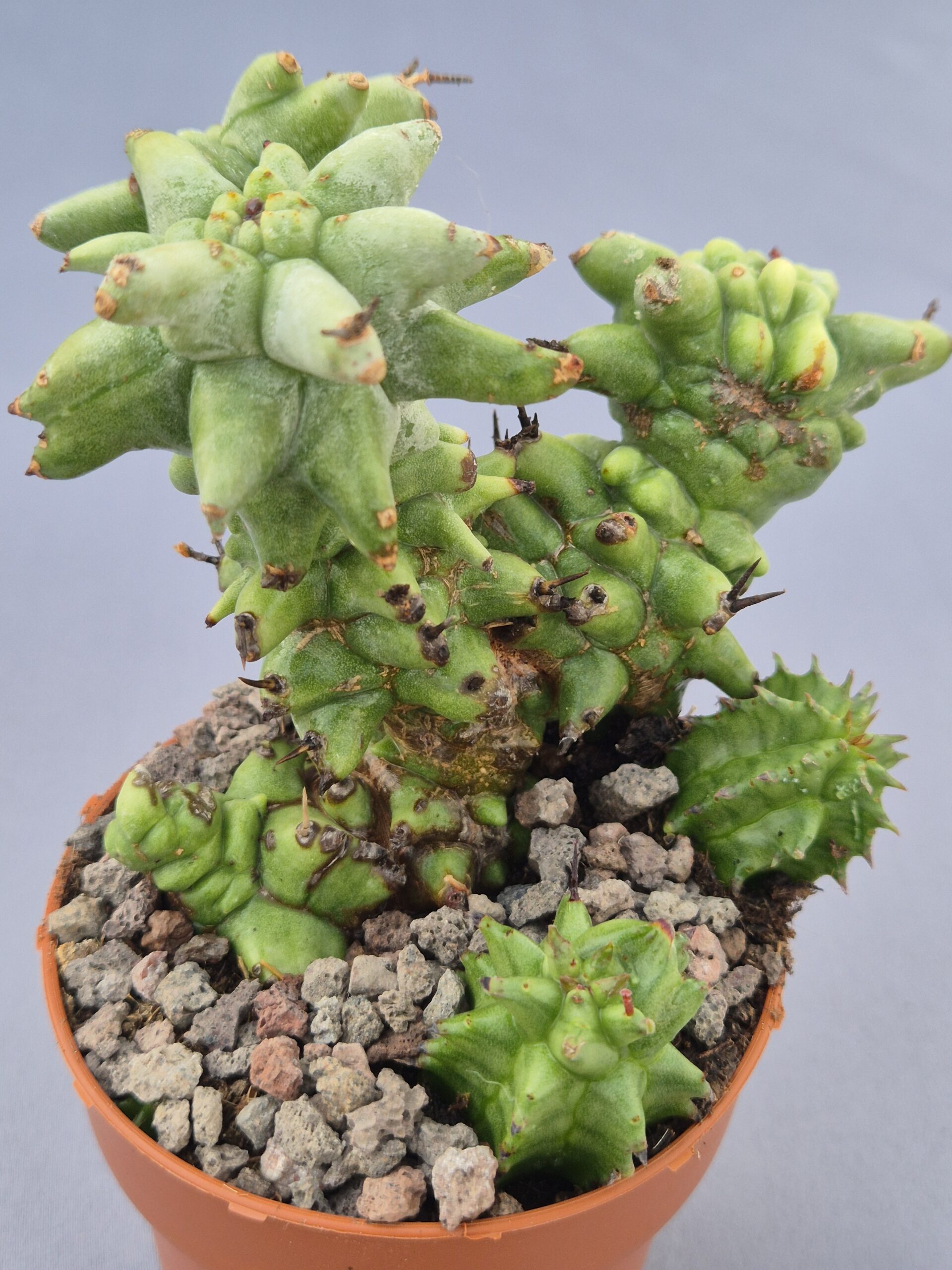 Euphorbia horrida monstruosa es una forma excepcional y muy buscada de Euphorbia horrida, apreciada por su crecimiento deformado y su fuerte carácter escultórico, que rompe con la simetría clásica de la especie.