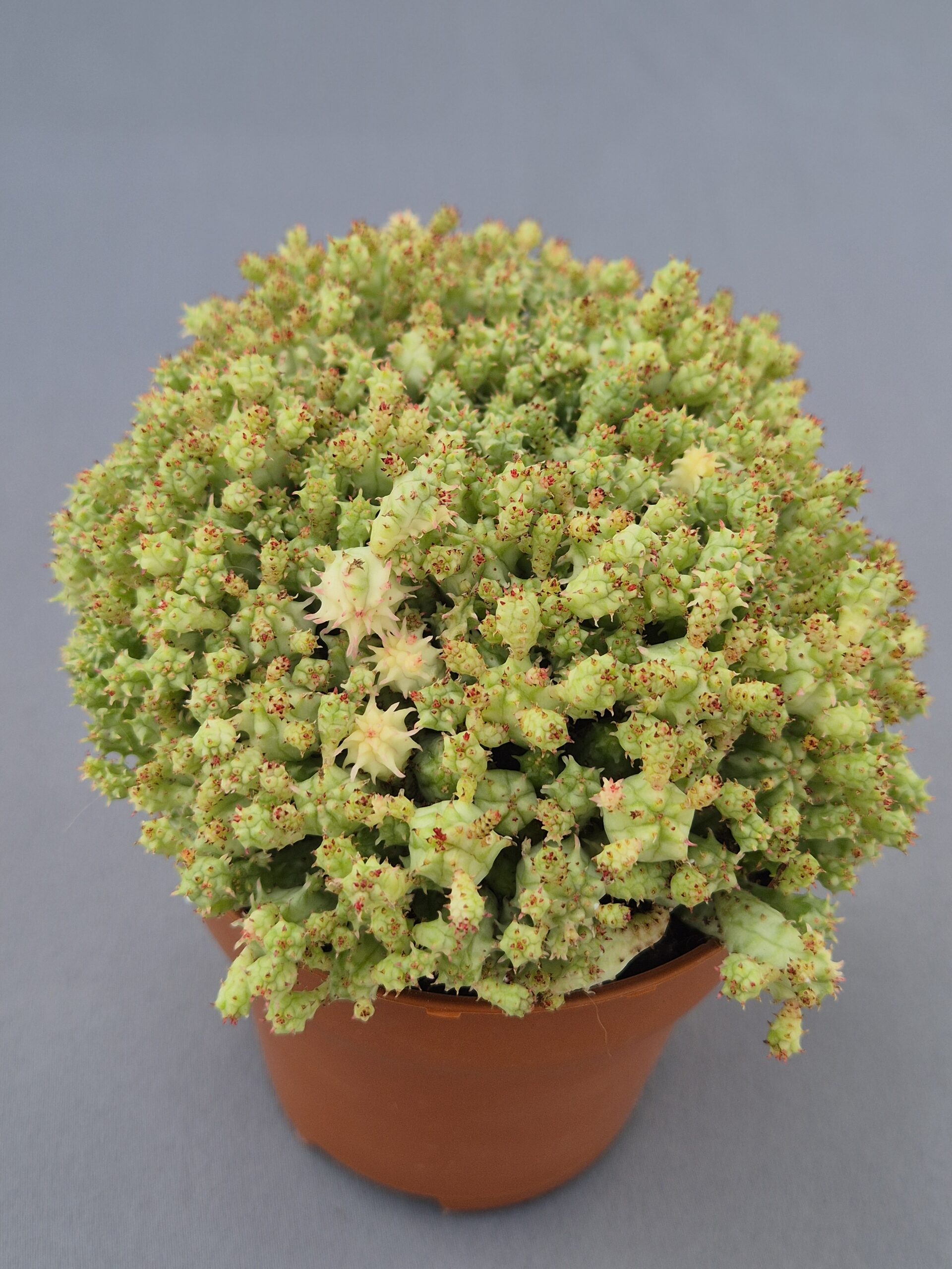 Euphorbia variegata es una suculenta de crecimiento denso y aspecto muy singular, apreciada por su porte compacto y su variegación irregular, que le aporta un gran valor ornamental.