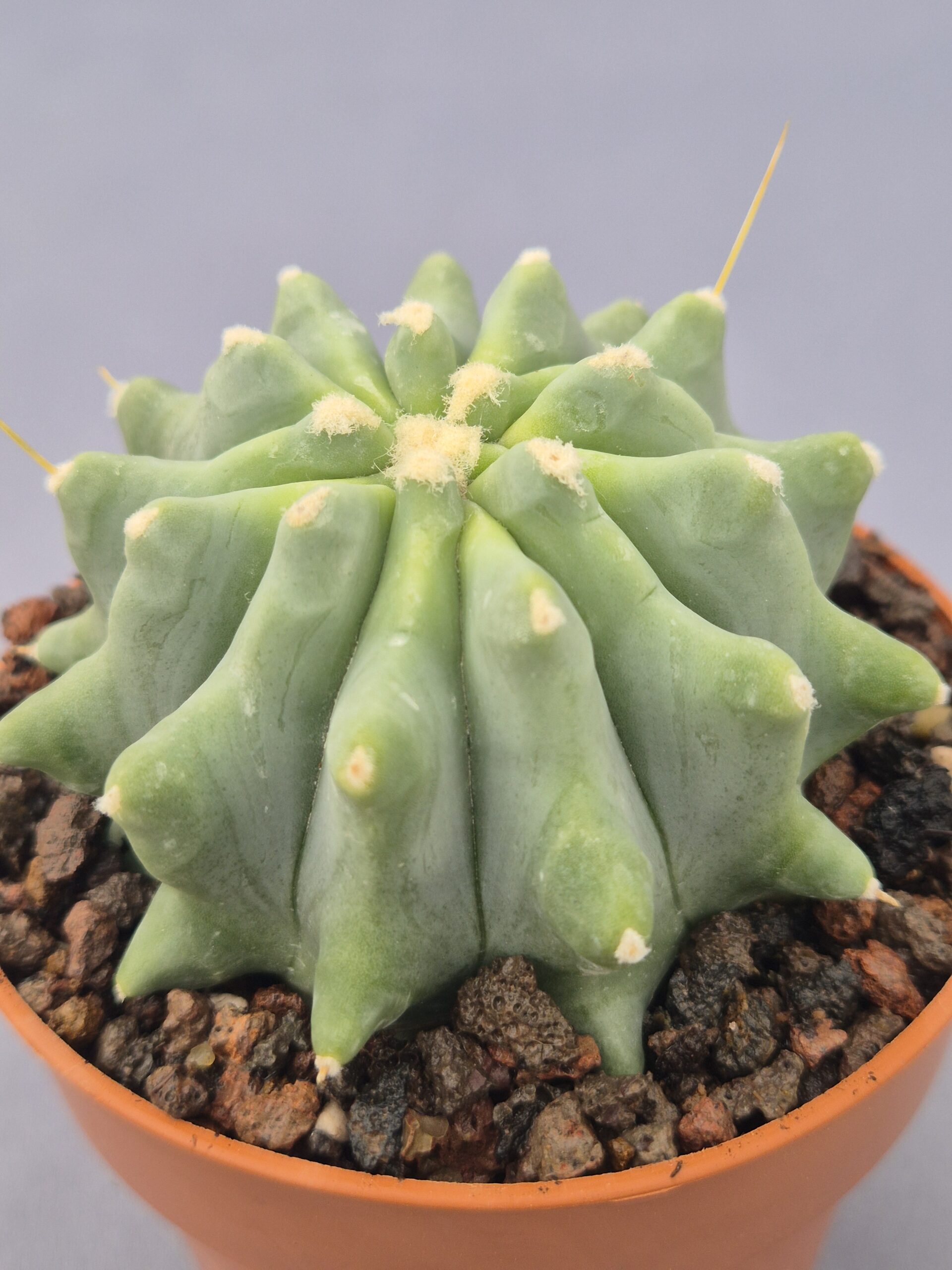 Ferocactus glaucescens var. inermis es una variedad muy apreciada por su aspecto limpio y escultórico, caracterizada por la ausencia casi total de espinas. Su silueta compacta y su coloración suave la convierten en una pieza elegante dentro de cualquier colección de cactus.