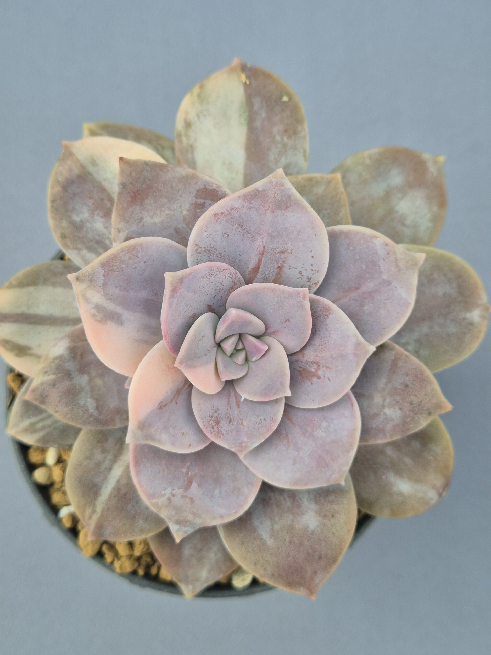 Graptopetalum superbum variegada es una suculenta de crecimiento compacto y gran valor ornamental, apreciada por su roseta simétrica, su textura empolvada y la delicada variegación en tonos pastel. Su aspecto elegante y botánico la convierte en una pieza muy buscada tanto por coleccionistas como para composiciones minimalistas.