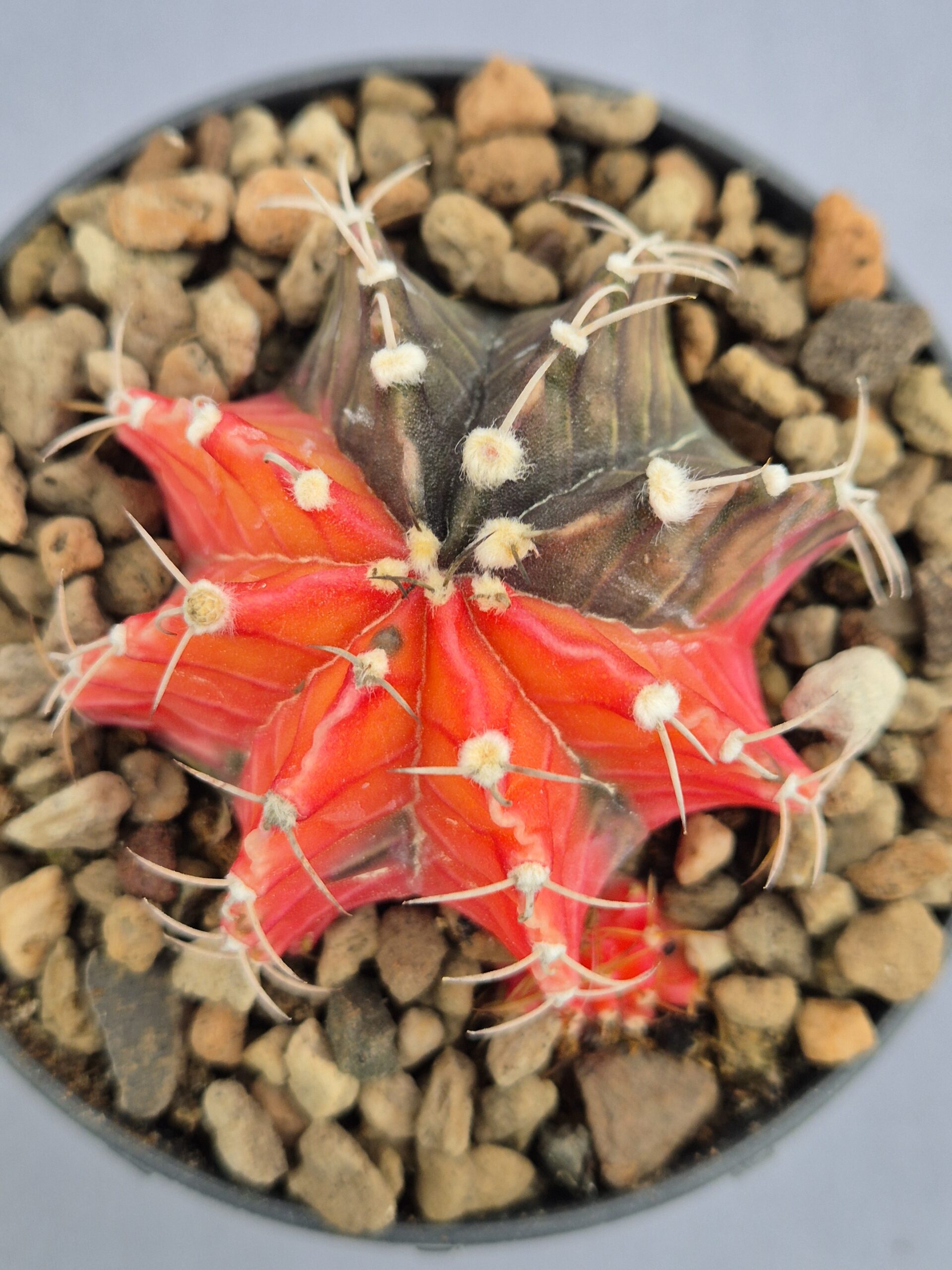Este Gymnocalycium friedrichii variegata destaca por su combinación de tonos rojos intensos, rosas y naranjas, acompañados de franjas oscuras en verde y marrón que realzan aún más la profundidad del color. Su forma estrellada, junto con sus espinas finas y bien distribuidas, le otorgan una apariencia muy atractiva y equilibrada.