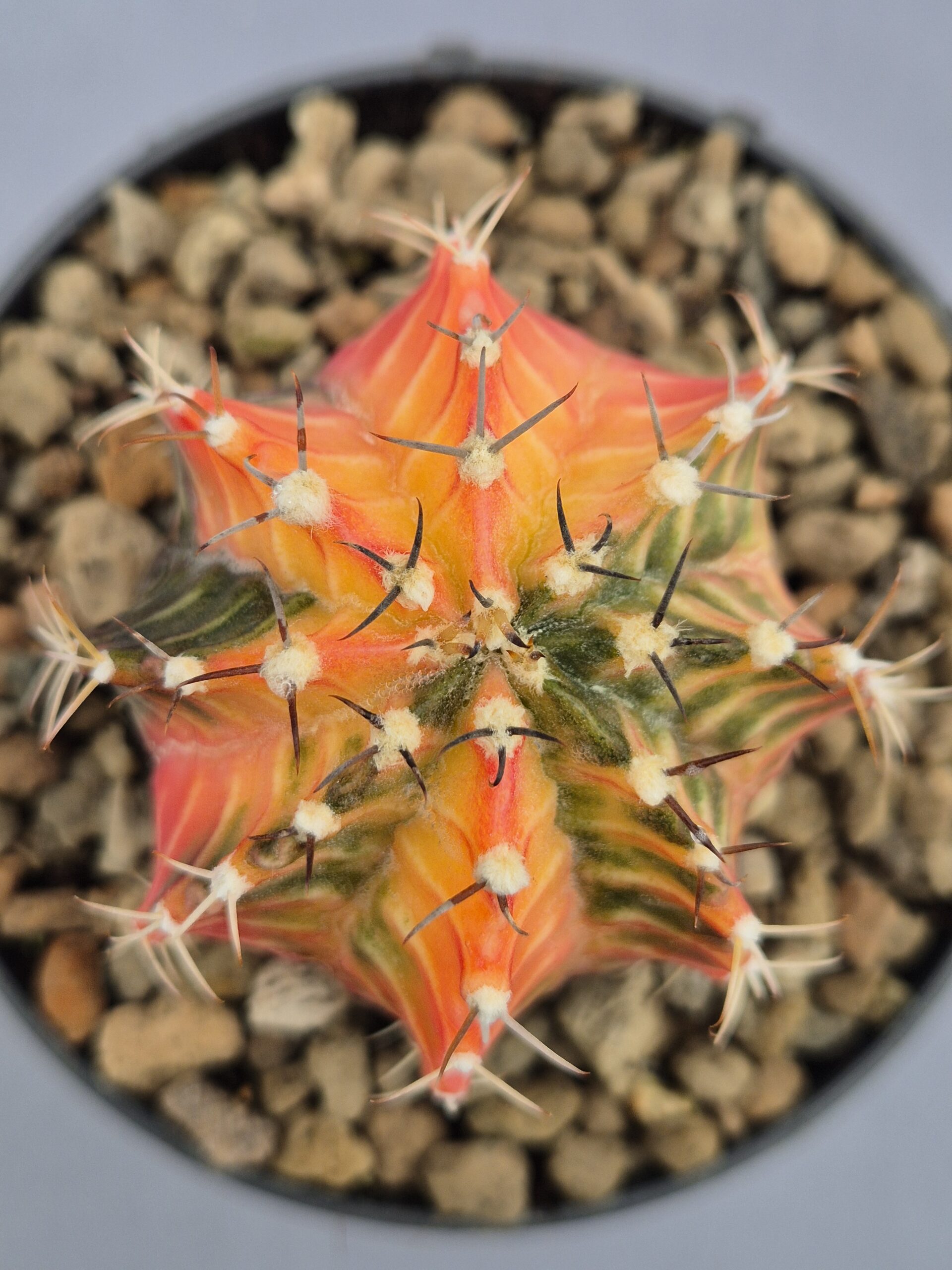 🎨Color: Variegación muy vibrante, con naranjas y rojos brillantes fusionados con zonas verdes profundas y matices rosados que resaltan aún más la estructura del cactus.