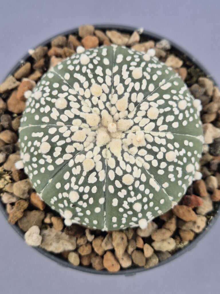 🌿Forma: Cuerpo globoso y ligeramente aplanado con costillas altas y onduladas. Areolas lanosas y espinas rectas, claras y bien distribuidas.