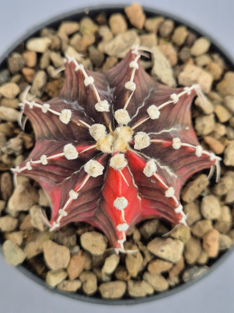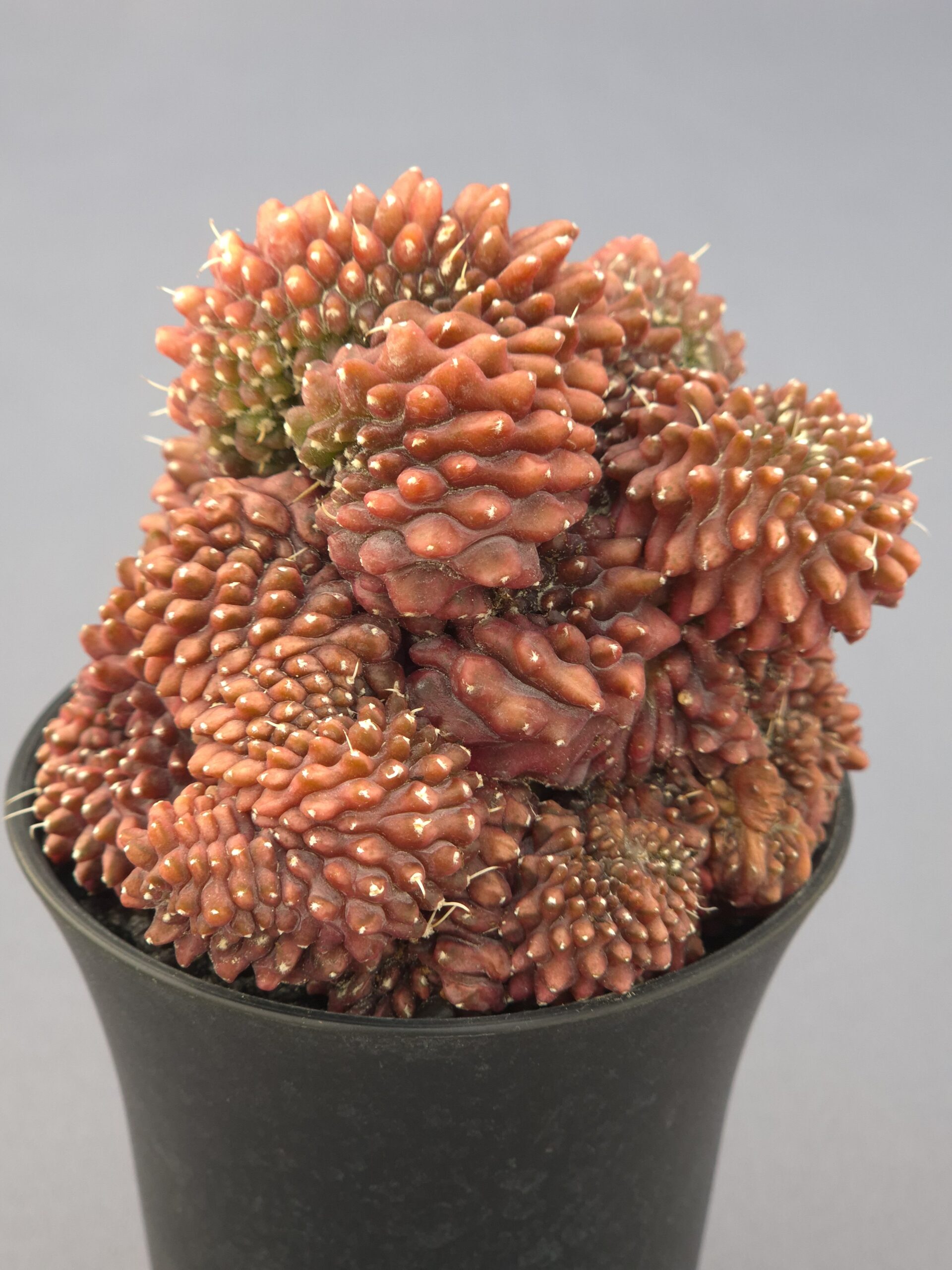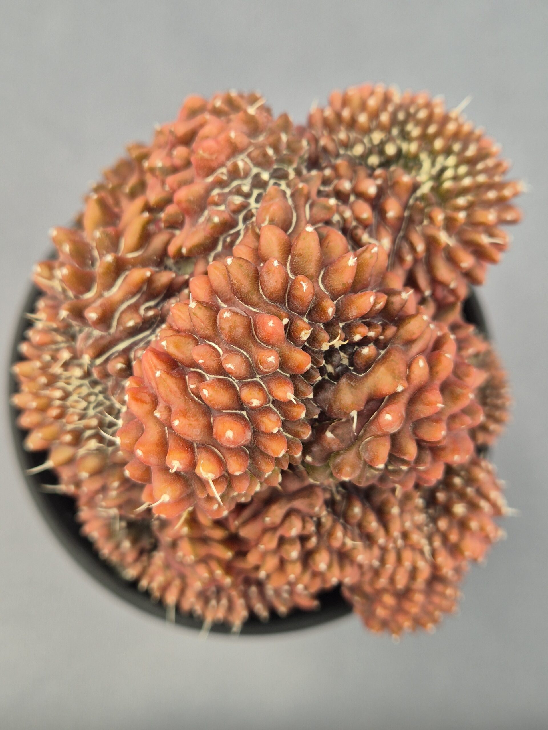 Esta espectacular forma crestada es una auténtica joya para cualquier amante de los cactus. Su superficie forma ondulaciones y montículos que se entrelazan creando una estructura completamente escultórica, casi abstracta, que parece diseñada a mano. Su coloración rojiza intensa, con matices granates y tonos vivos que cambian según la luz, le aporta una presencia visual impactante y muy poco común. Es una planta que atrapa miradas al instante y que destaca por su carácter único y vibrante.