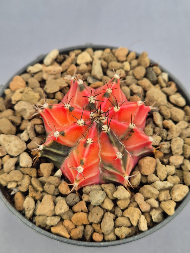 Este espectacular Gymnocalycium mihanovichii variegata destaca por su vibrante mezcla de colores y sus formas angulosas bien marcadas. Es una planta muy llamativa, ideal para coleccionistas que buscan ejemplares únicos y visualmente potentes. Su combinación de tonos intensos y espinación contrastada lo convierte en una pieza protagonista dentro de cualquier colección.