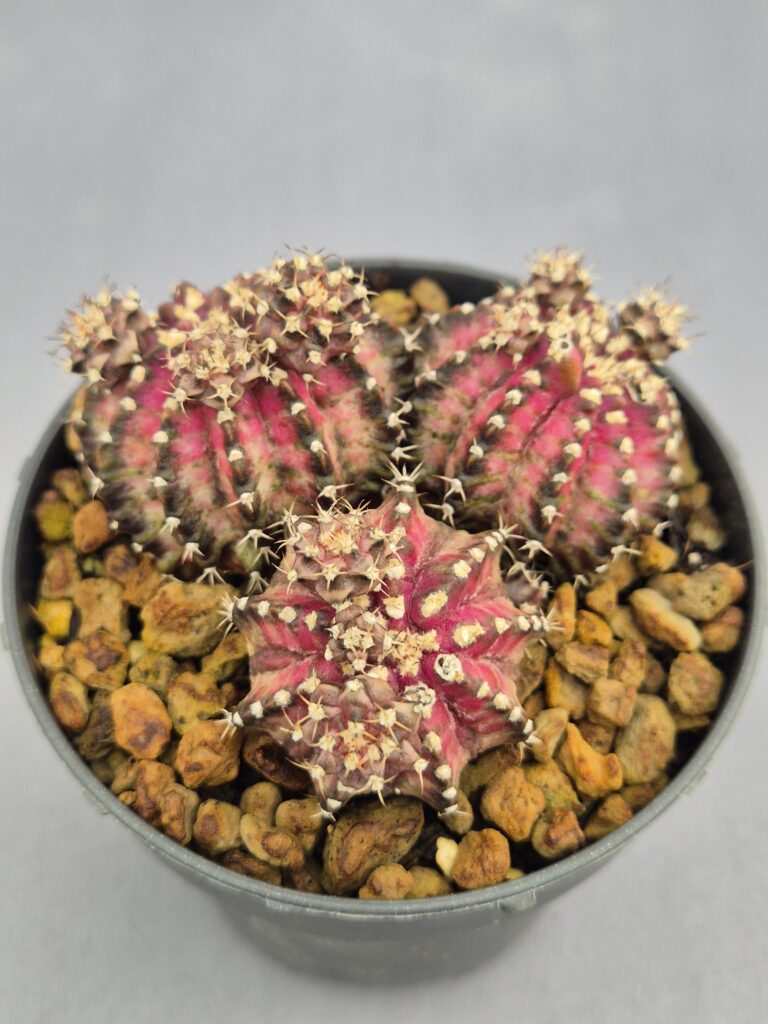 Este Gymnocalycium mihanovichii variegata destaca por su espectacular mezcla de colores cálidos e intensos, con transiciones entre rojo, rosa, naranja y verde oliva que lo convierten en una pieza verdaderamente única. Su forma estrella y sus espinas finas aportan aún más carácter a este ejemplar tan deseado por coleccionistas.