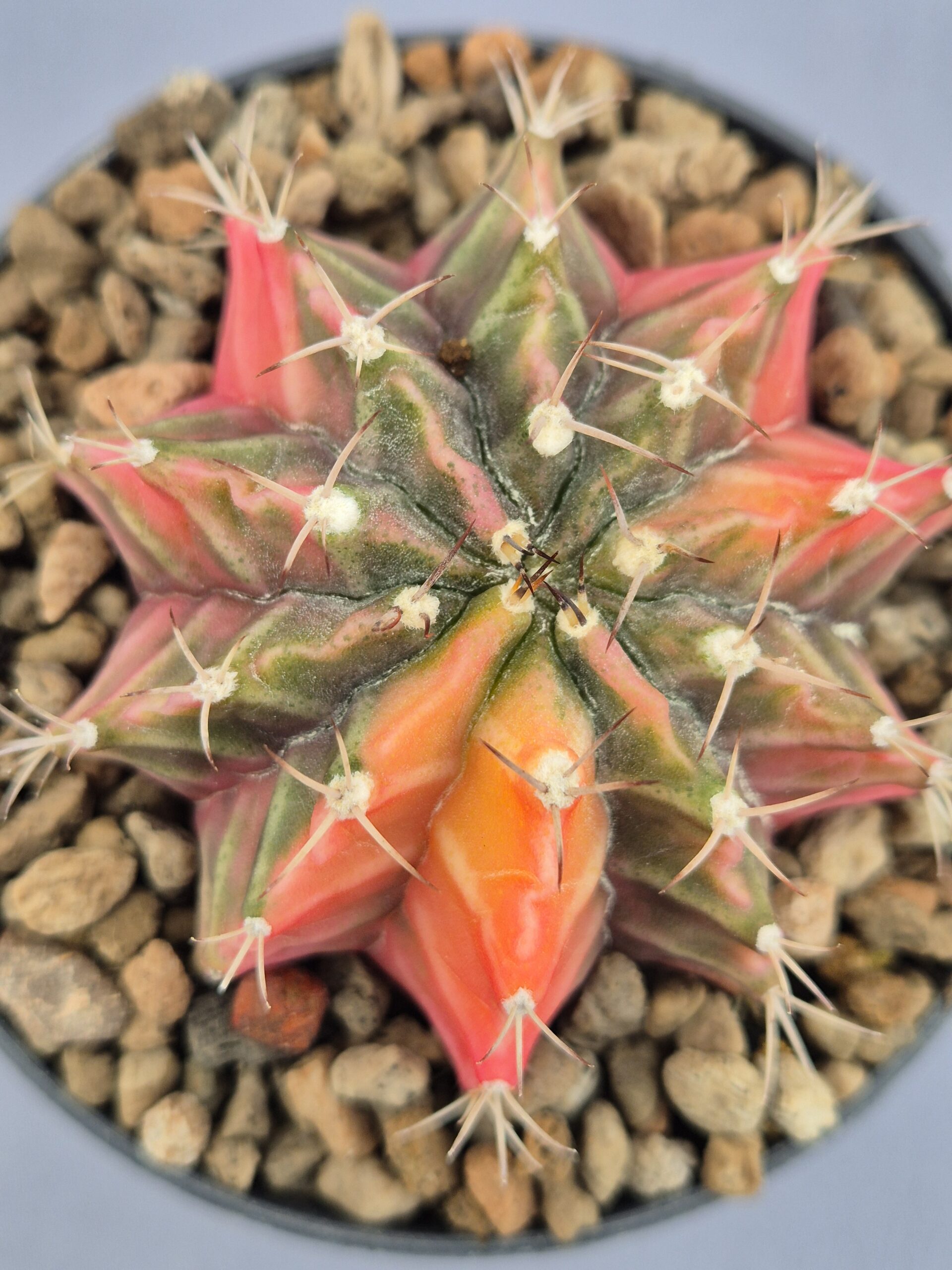 Este Gymnocalycium mihanovichii variegata destaca por su espectacular mezcla de colores cálidos e intensos, con transiciones entre rojo, rosa, naranja y verde oliva que lo convierten en una pieza verdaderamente única. Su forma estrella y sus espinas finas aportan aún más carácter a este ejemplar tan deseado por coleccionistas.