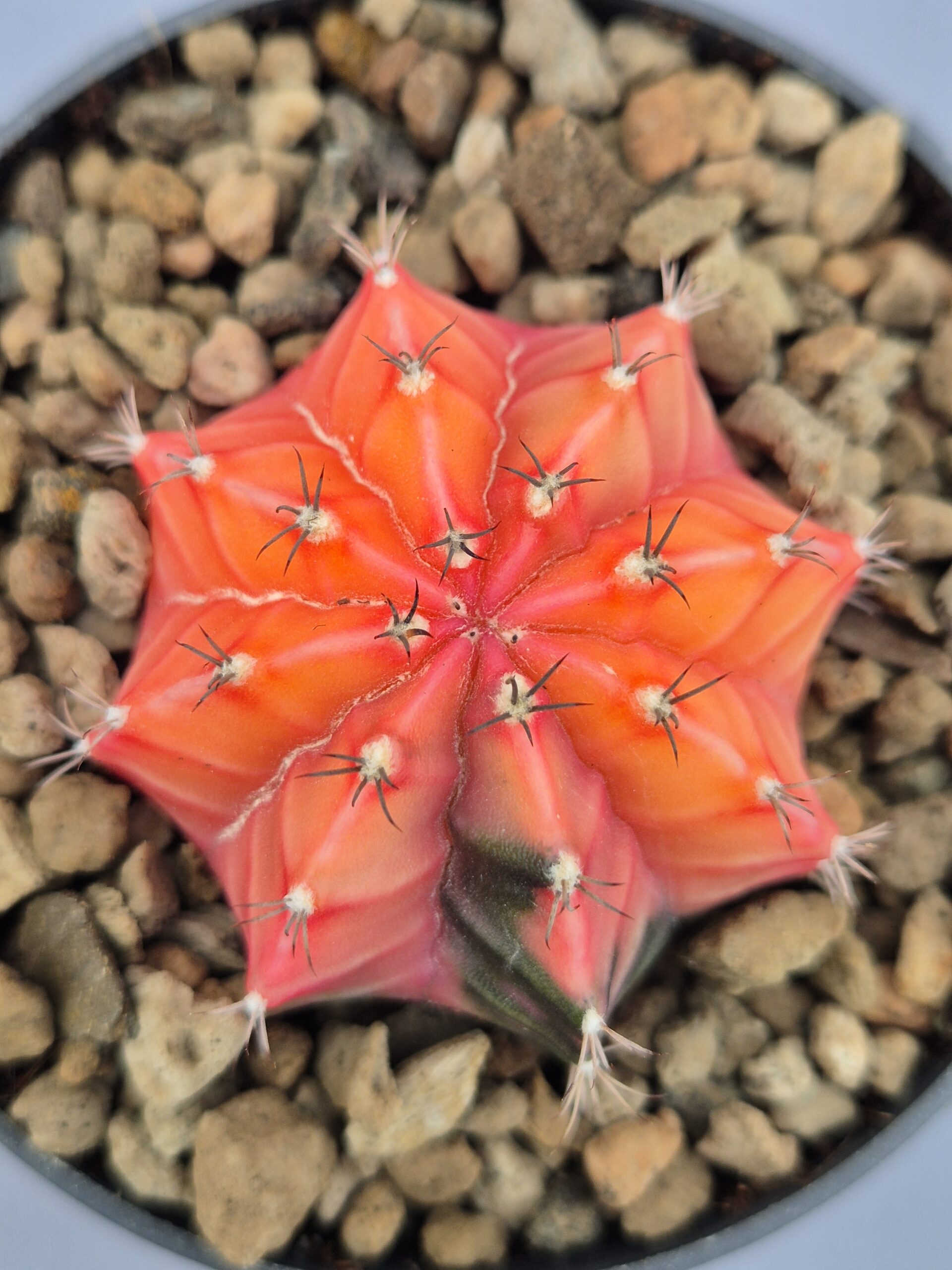 Este Gymnocalycium mihanovichii variegata destaca por su intensa coloración en tonos rojo brillante, naranja y rosa, con ligeras zonas verdes en la base que realzan aún más el contraste. Su forma estrellada y sus costillas bien definidas lo convierten en una pieza sumamente llamativa.