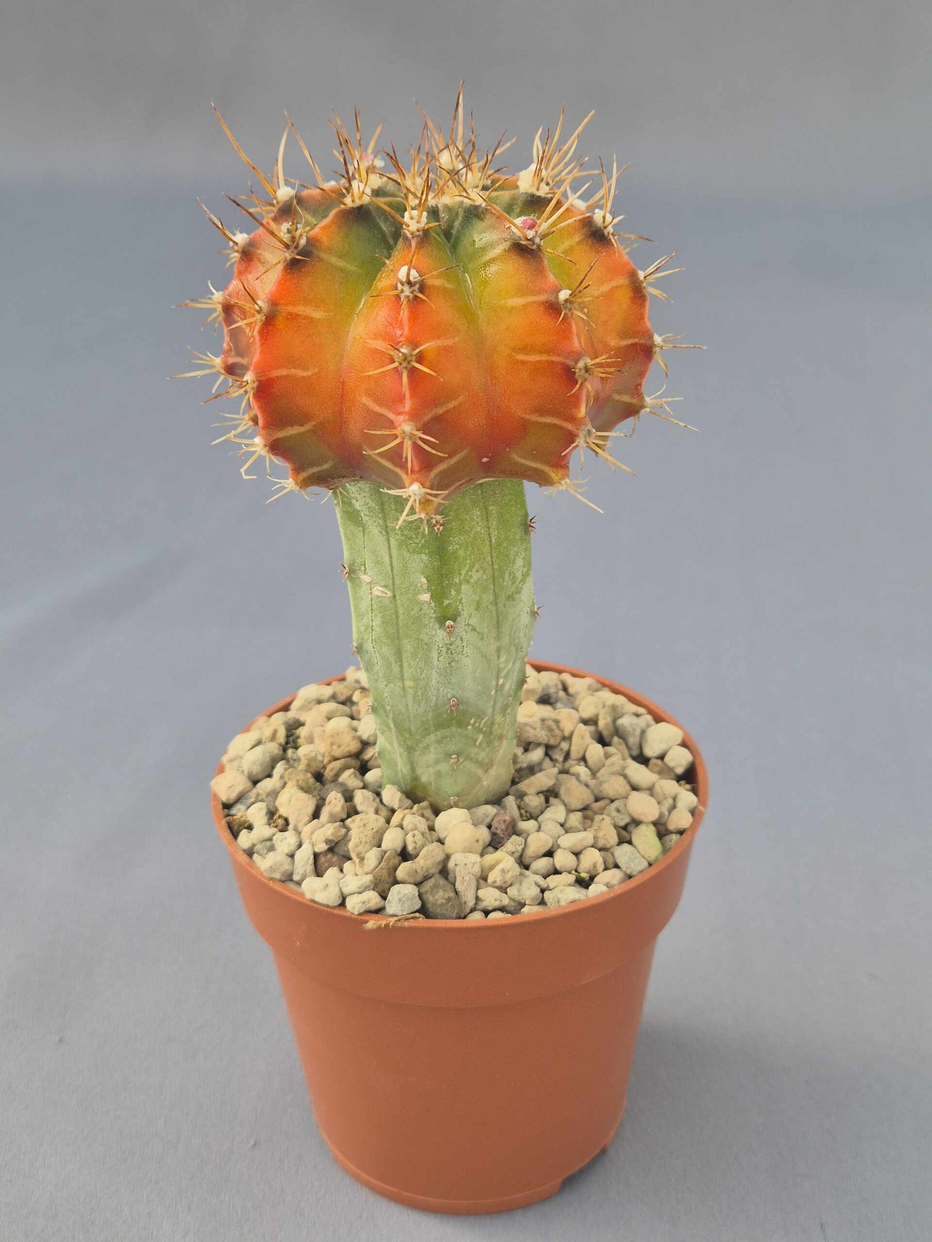 Gymnocalycium variegado injertado es un cactus muy apreciado por su intenso contraste de colores y su forma compacta. Gracias al injerto, el crecimiento es más vigoroso y la variegación se mantiene con gran intensidad, creando un ejemplar muy llamativo y decorativo.