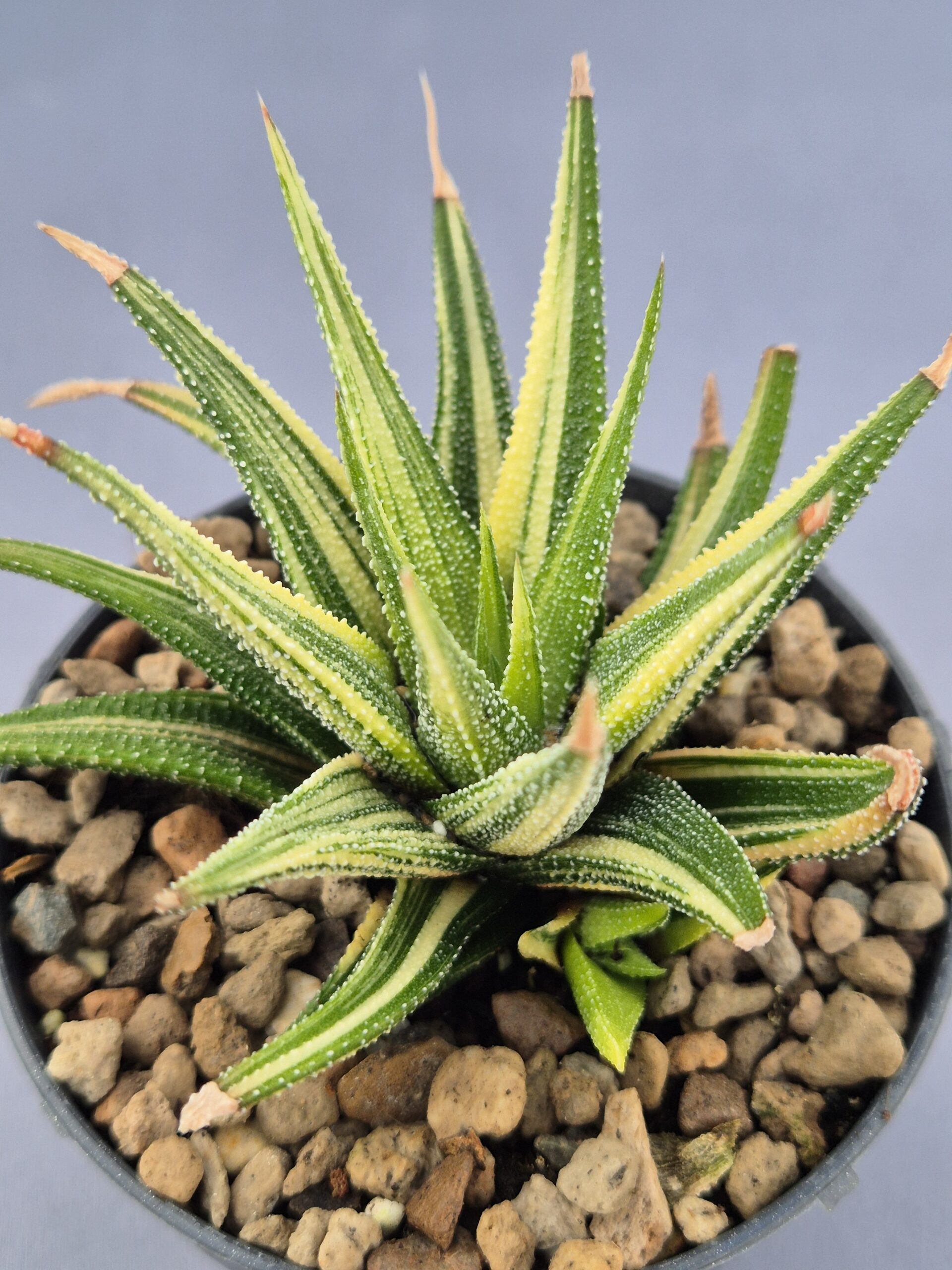 Una espectacular suculenta variegada conocida por sus hojas alargadas y llenas de textura. Sus tonalidades verdes combinadas con franjas amarillas aportan un contraste muy llamativo. Destaca por su resistencia y su crecimiento en forma de roseta compacta, ideal para colecciones que buscan ejemplares con coloración inusual.