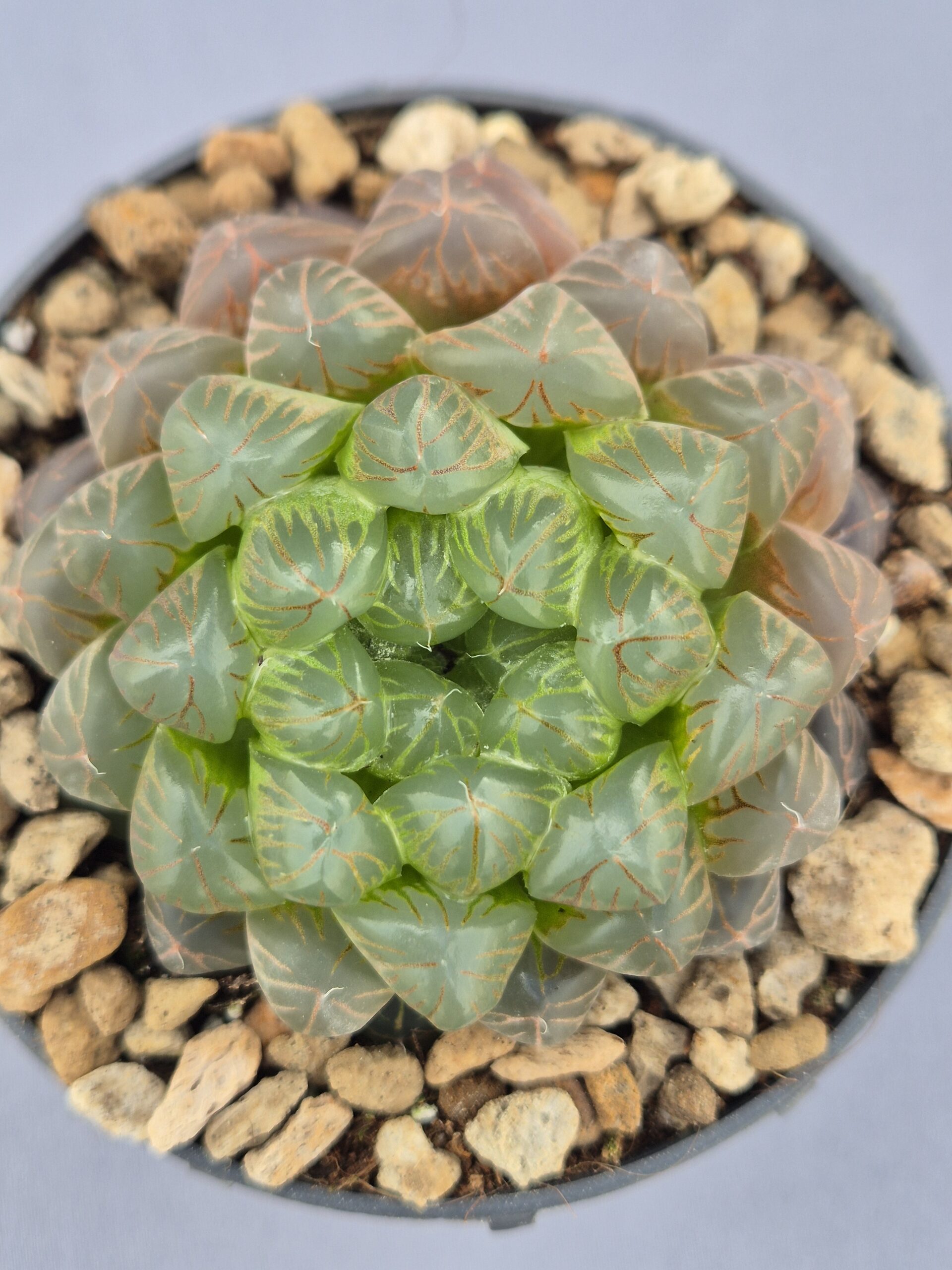 Esta preciosa Haworthia cooperi obtusa destaca por sus hojas translúcidas y llenas de brillo, que permiten el paso de la luz y le dan un aspecto casi cristalino. Es una planta compacta y muy ornamental, perfecta para coleccionistas que buscan ejemplares con ventanas bien marcadas y tonos delicados.