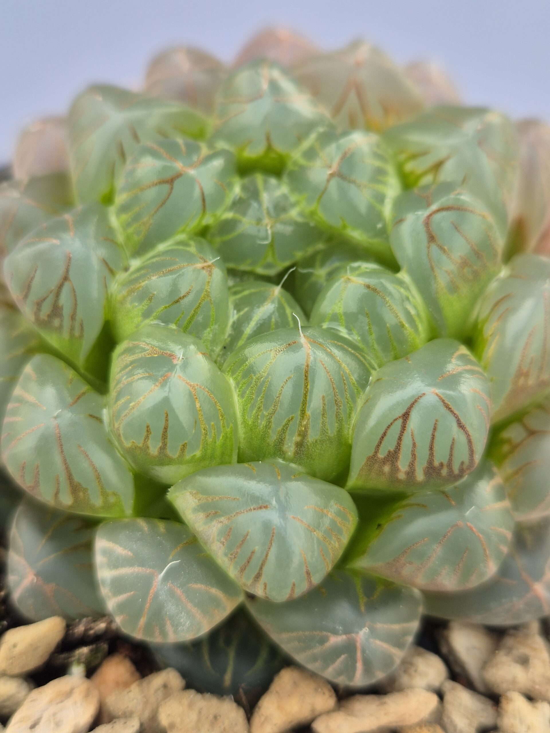 🌿Forma: Roseta compacta formada por hojas globosas y suavemente puntiagudas, con “ventanas” superiores muy visibles.