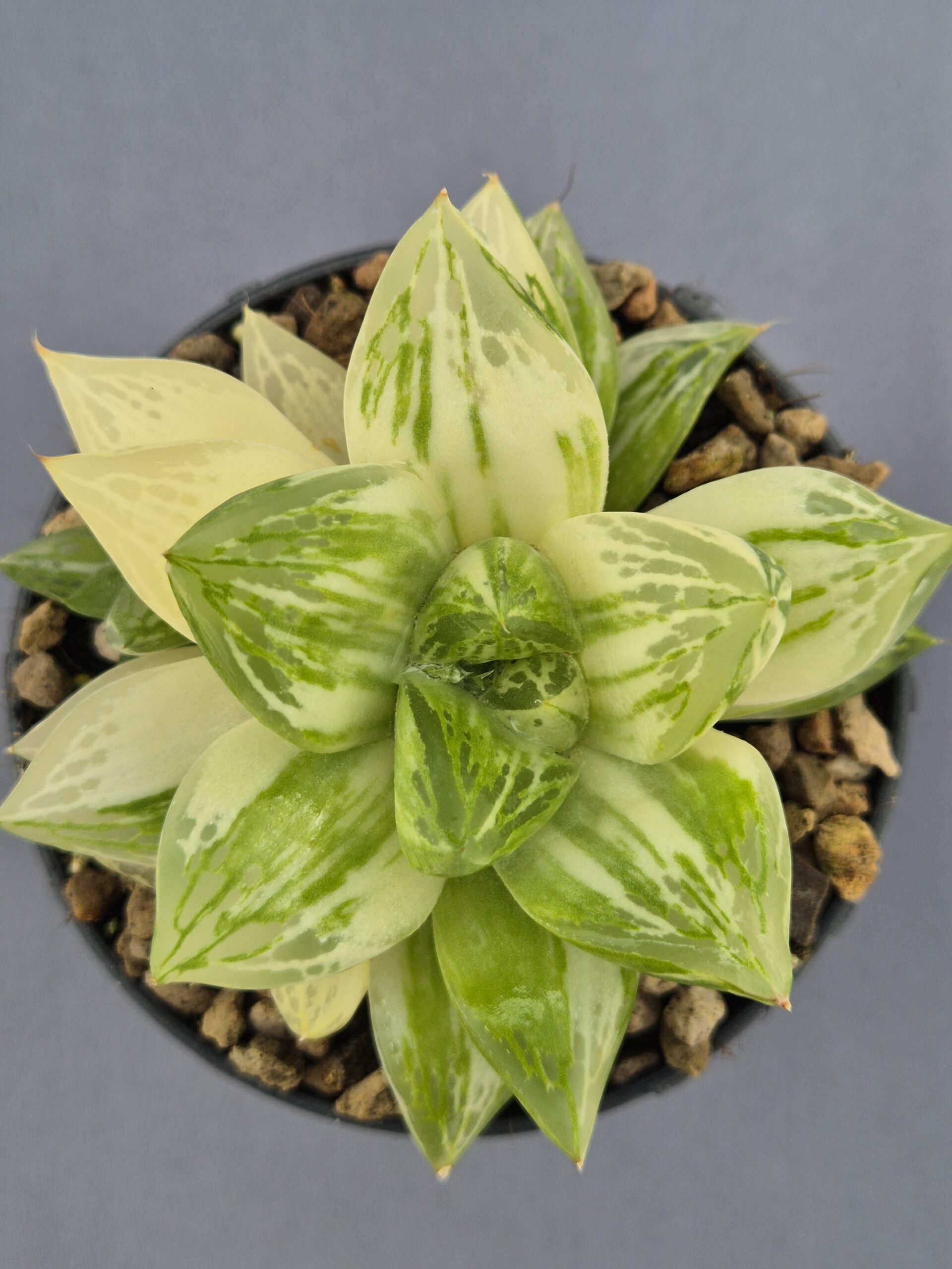 Esta hermosa suculenta destaca por sus hojas translúcidas con patrones variegados que van desde tonos verdes brillantes hasta cremas amarillentos, creando un contraste muy atractivo y luminoso.