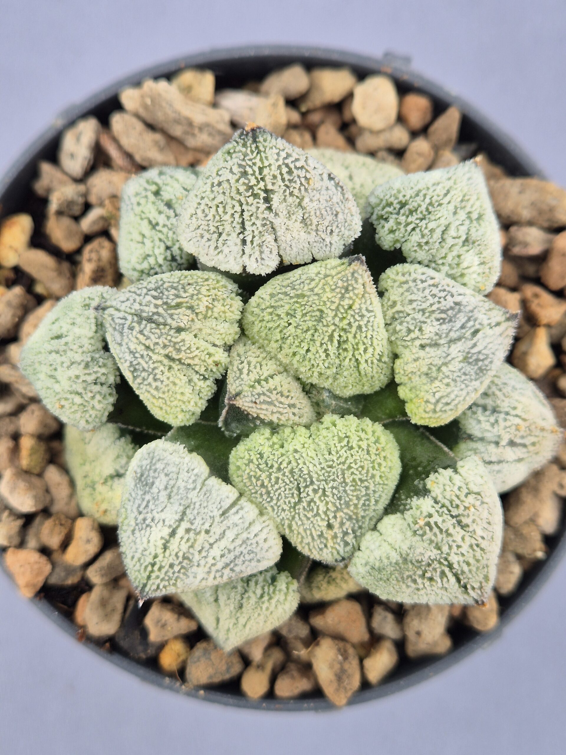 Esta Haworthia híbrida muestra un follaje compacto y muy texturizado, con un aspecto aterciopelado y patrones únicos que le otorgan una apariencia altamente coleccionable. Sus hojas triangulares y gruesas forman una roseta densa y simétrica, destacando por su superficie rugosa y coloración suave.