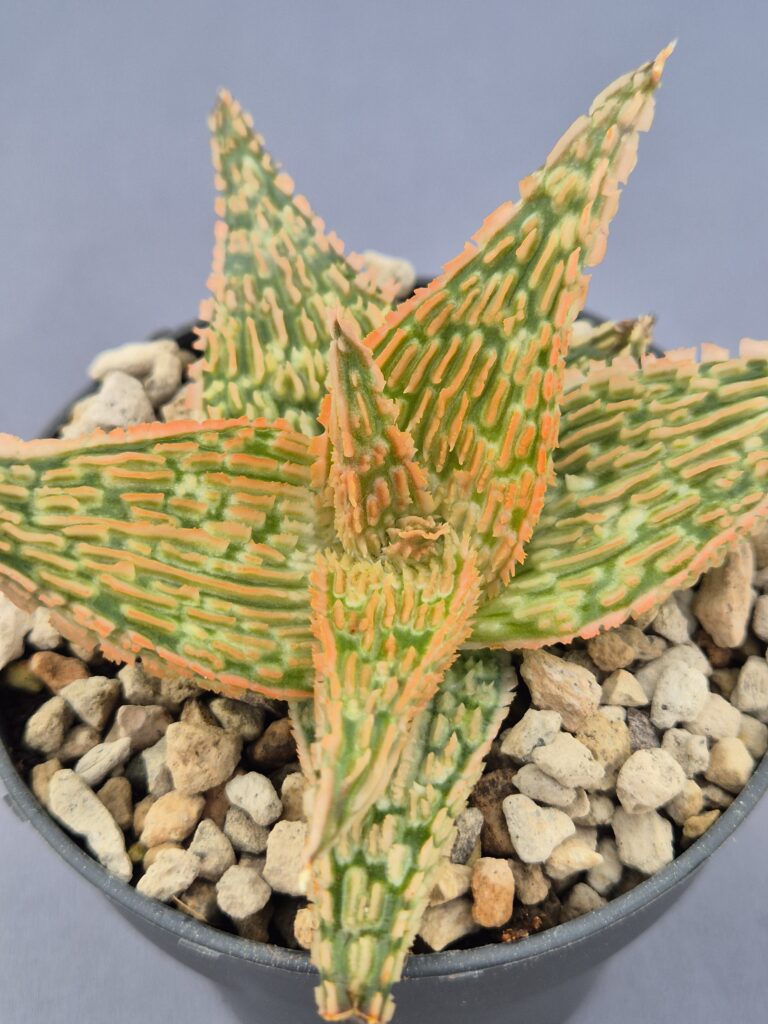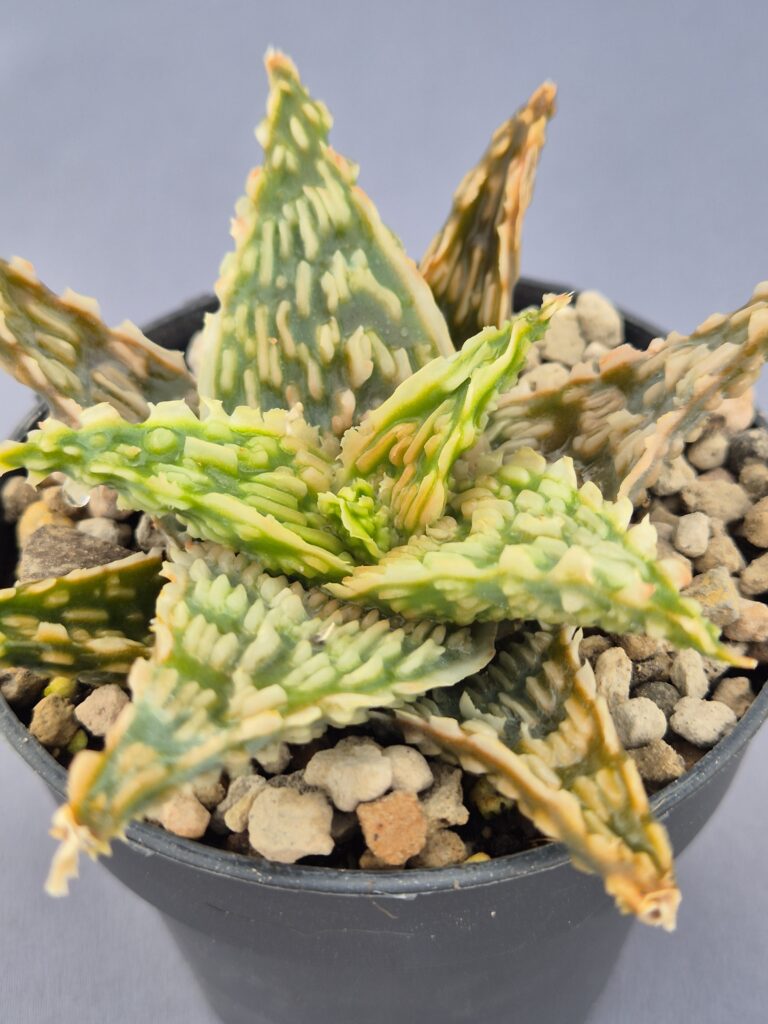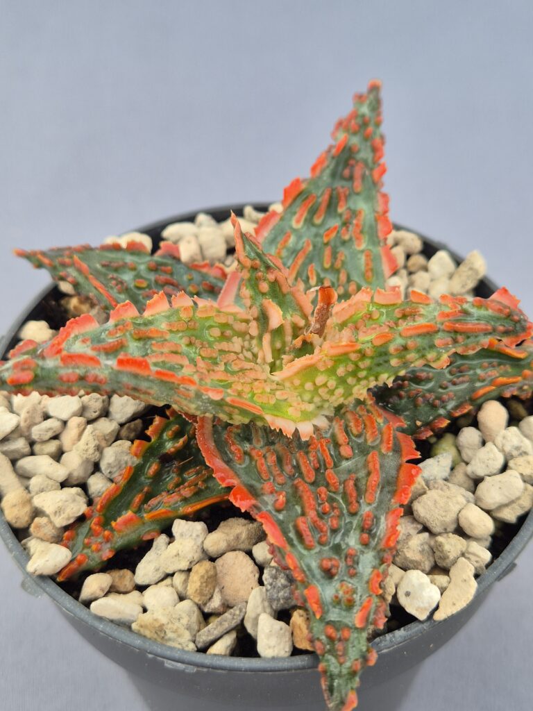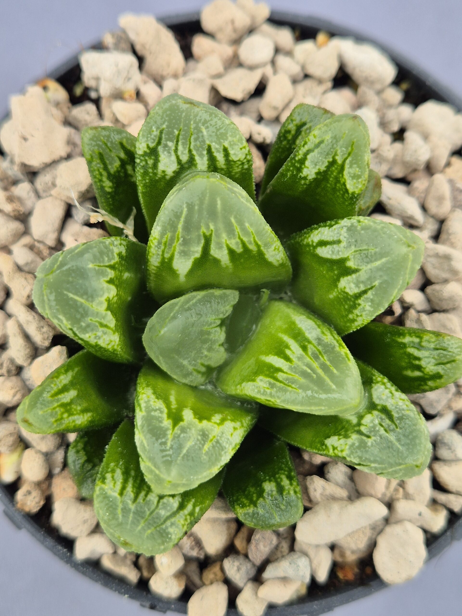 Esta Haworthia destaca por su apariencia translúcida y compacta, con hojas carnosas y brillantes que forman una roseta muy atractiva y de gran valor ornamental.
