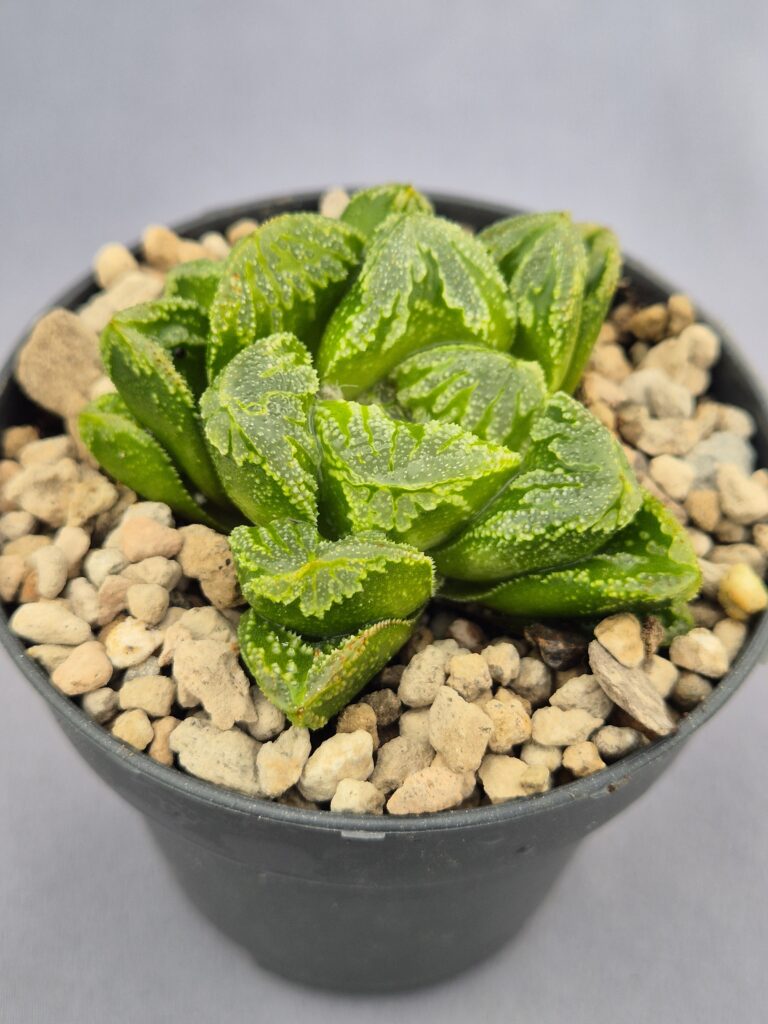 Esta Haworthia híbrida presenta una roseta compacta y geométrica, con hojas triangulares y una apariencia firme y escultórica. Su tono oscuro y su superficie marcada le dan un aspecto elegante y singular.