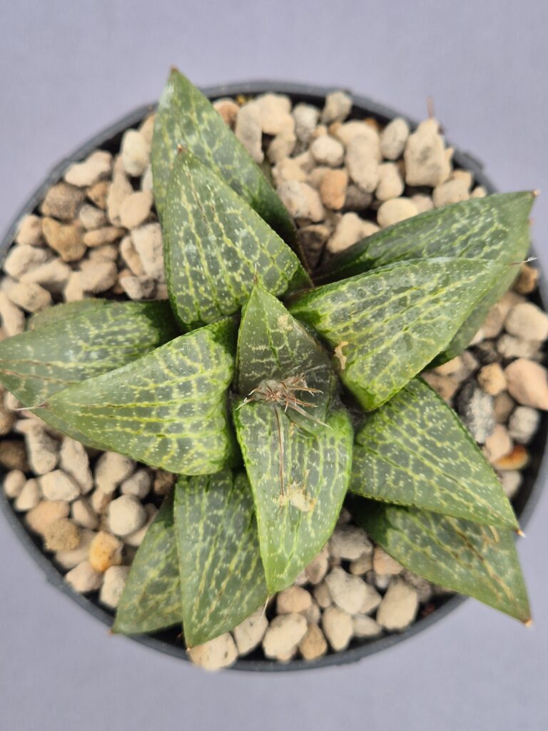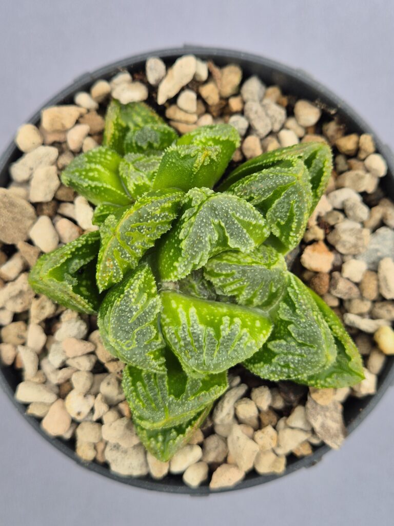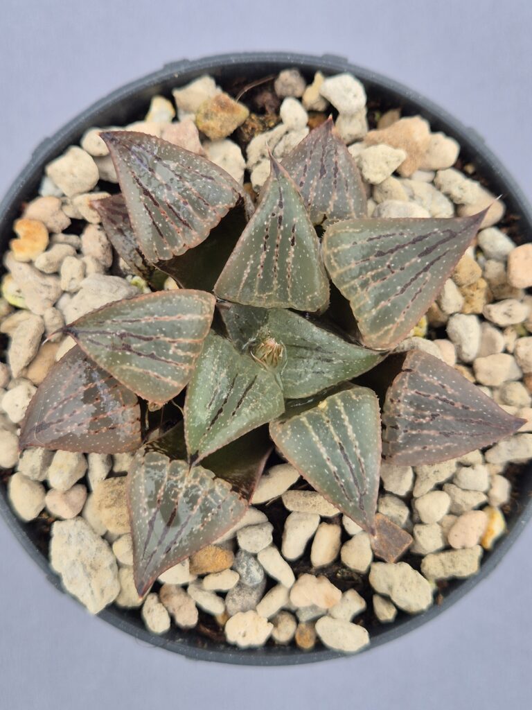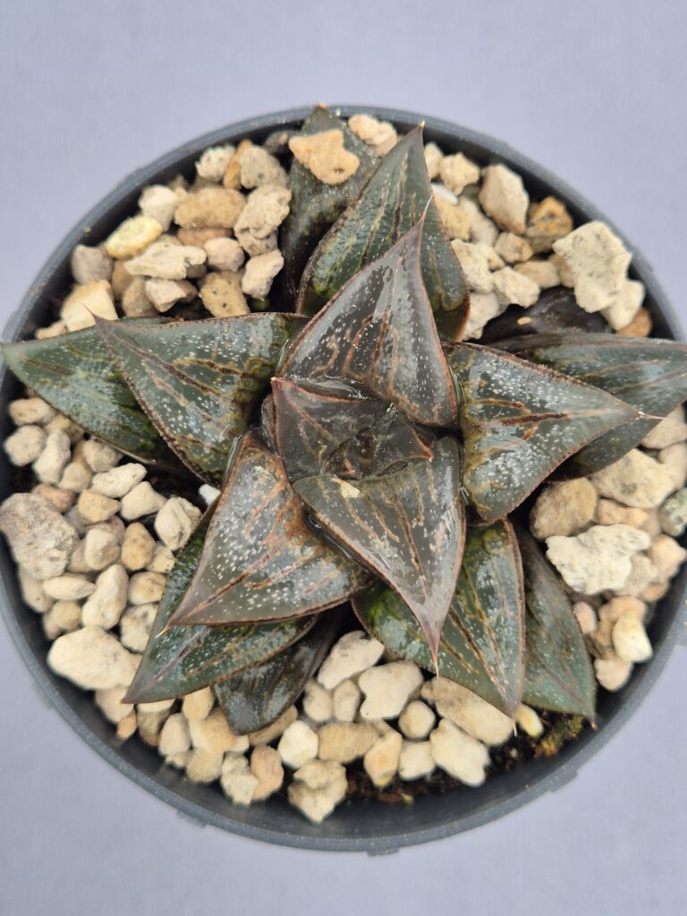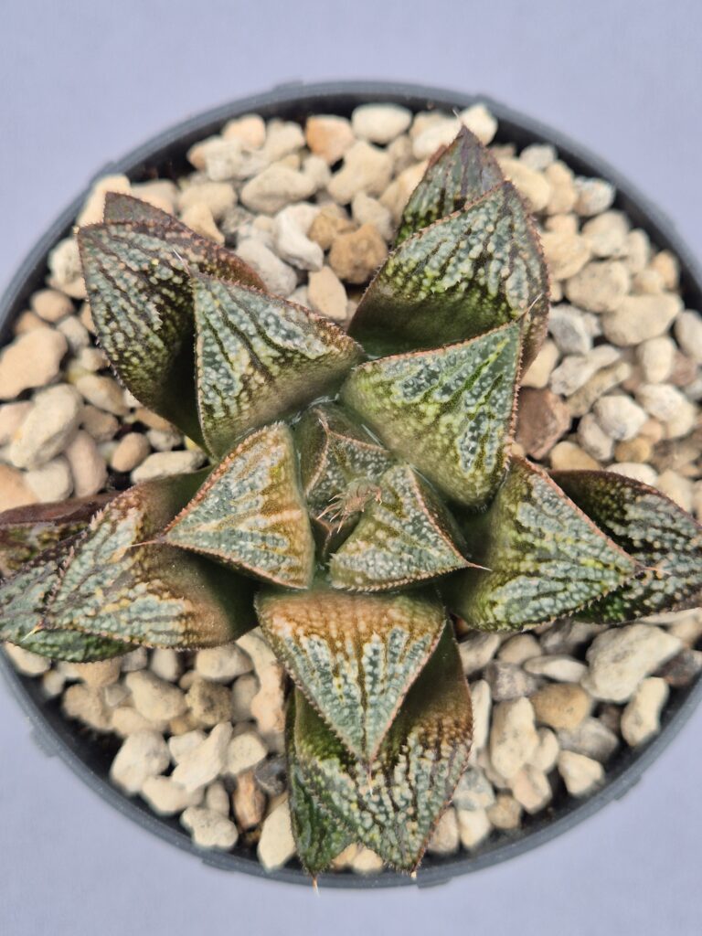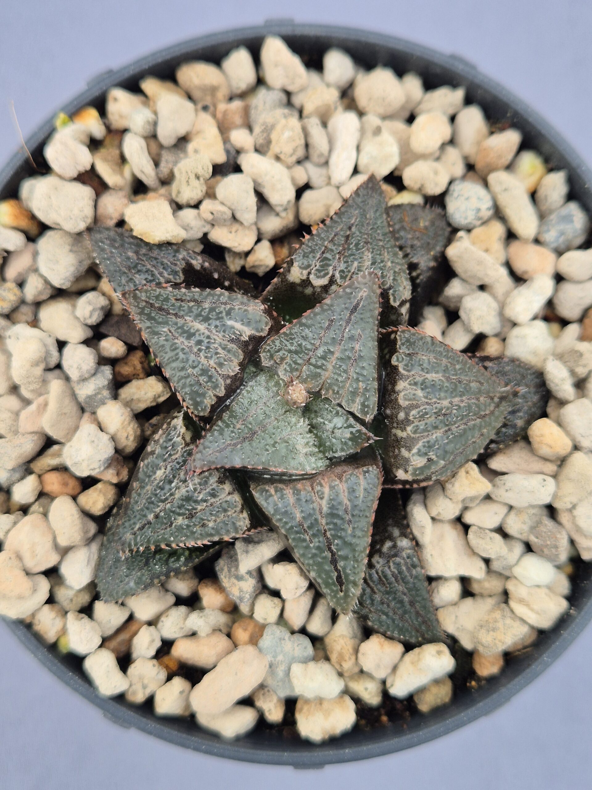 Esta Haworthia híbrida presenta una roseta compacta y geométrica, con hojas triangulares y una apariencia firme y escultórica. Su tono oscuro y su superficie marcada le dan un aspecto elegante y singular.