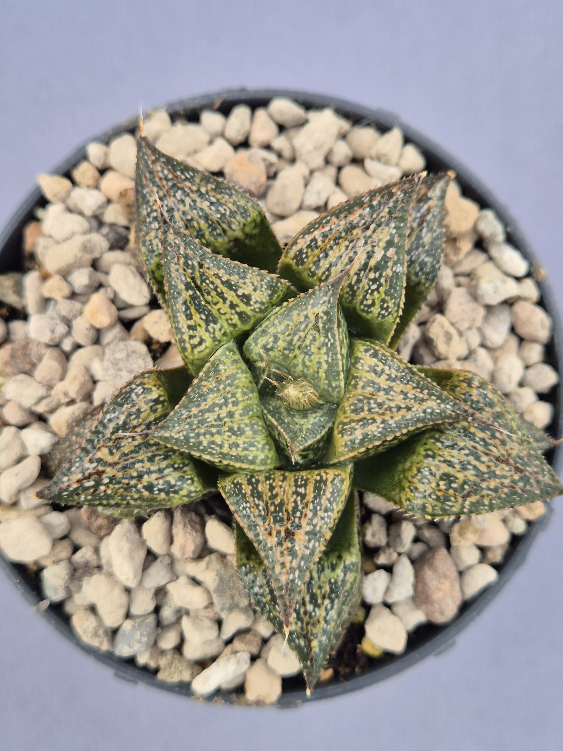 Esta Haworthia destaca por su apariencia compacta y robusta, con hojas triangulares y marcadas texturas que le dan un aspecto único. Sus tonos verdes moteados con matices amarillos y anaranjados la hacen especialmente atractiva y diferente dentro del género.