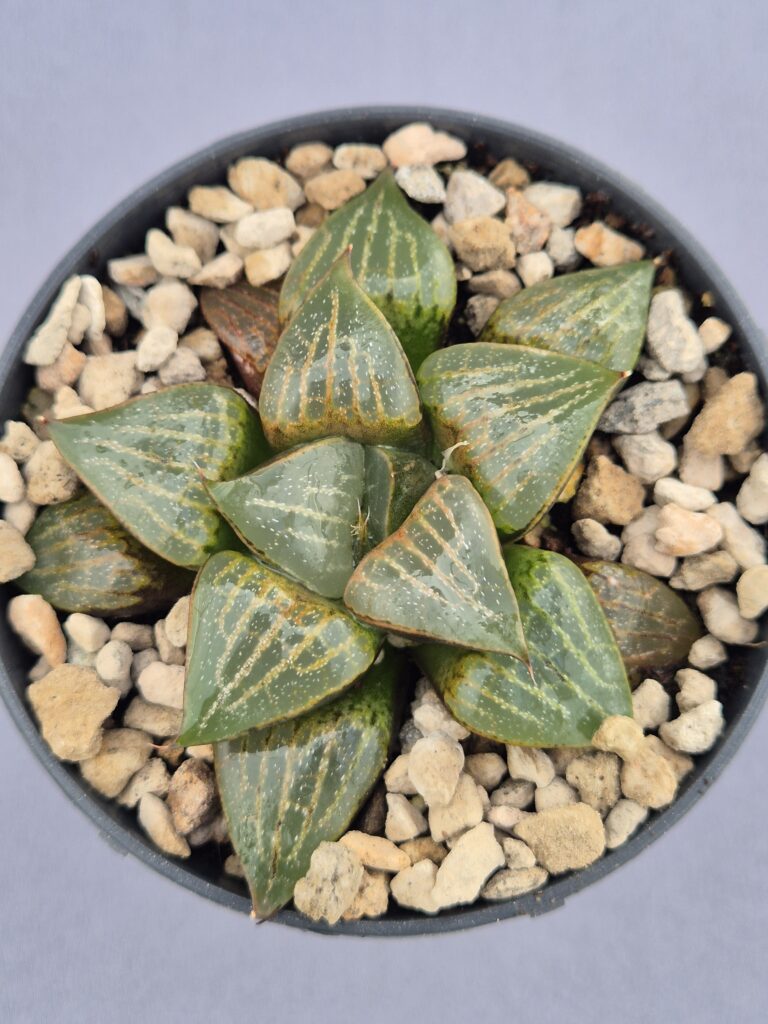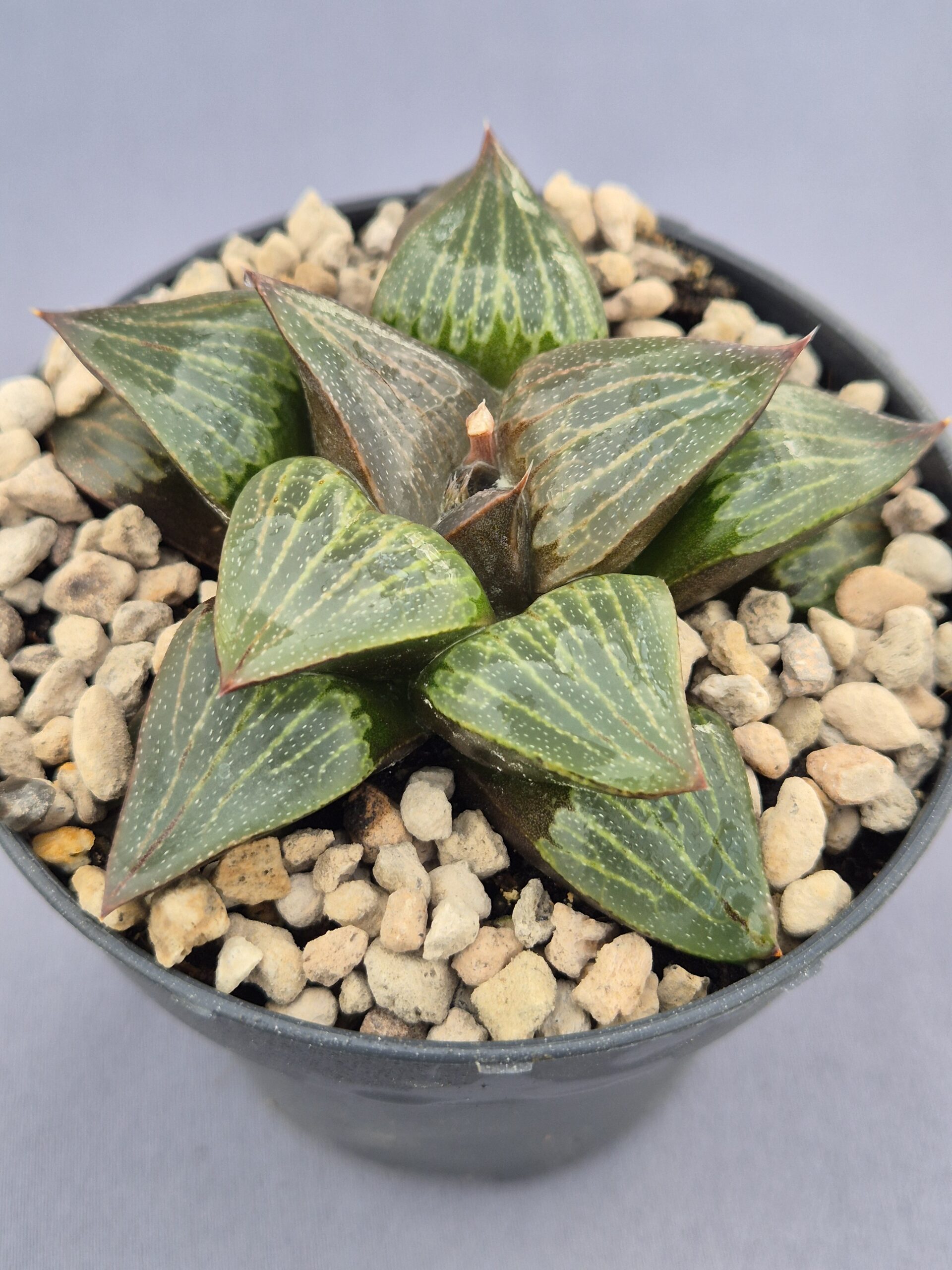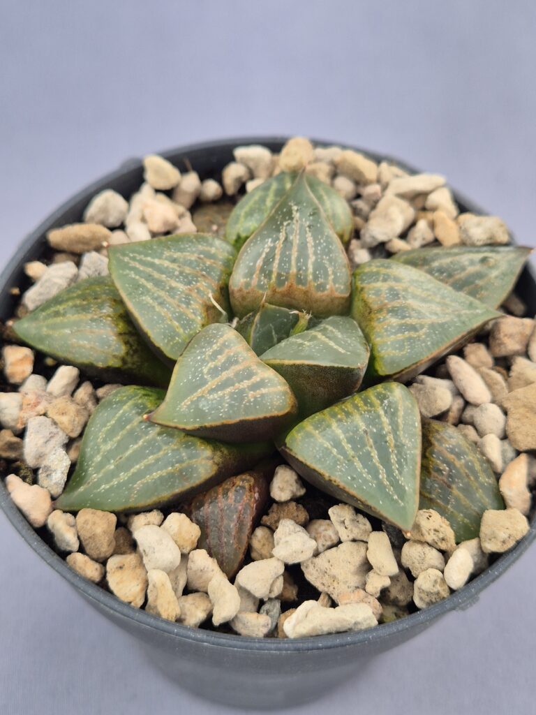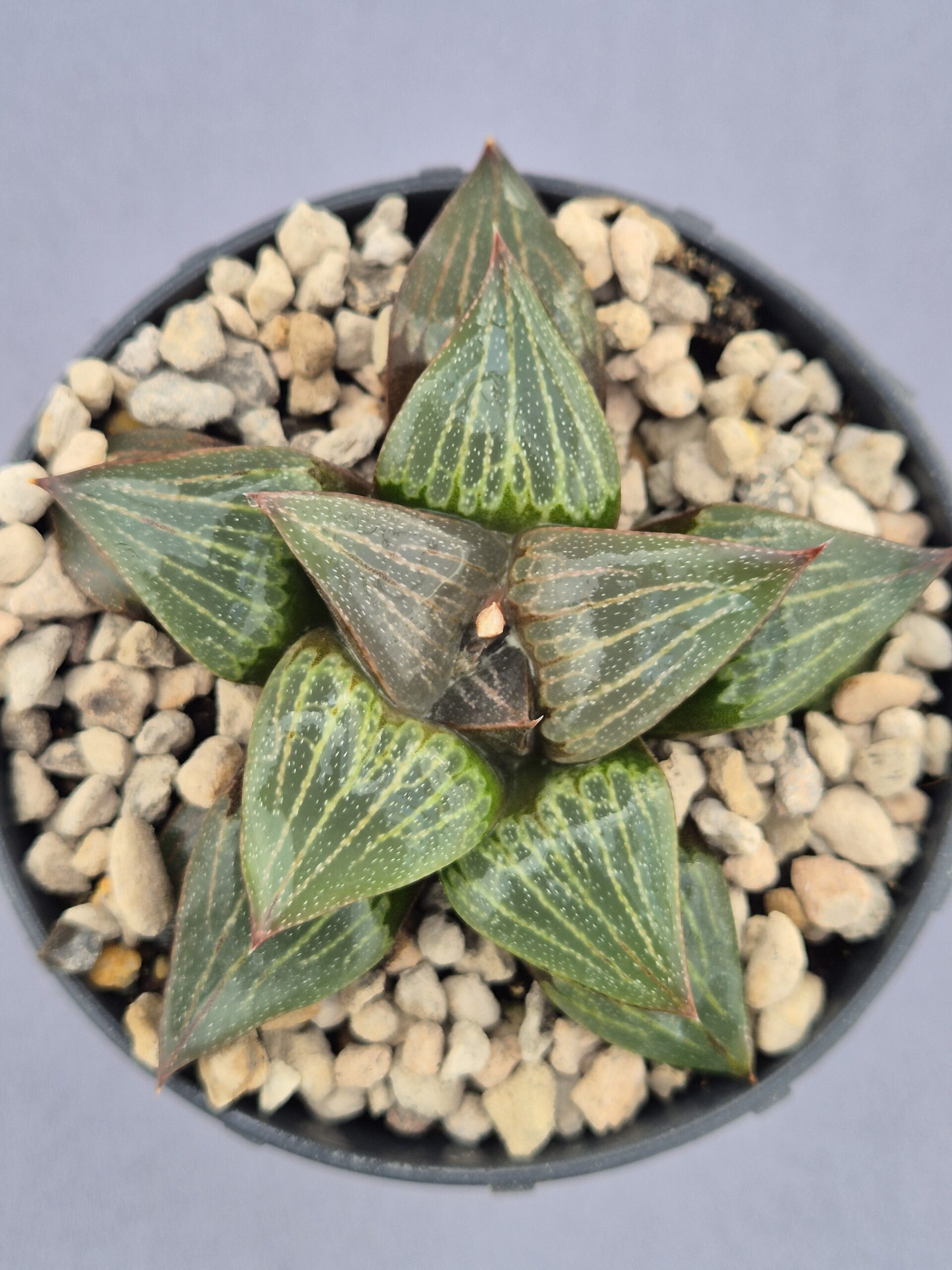 Haworthia híbrida de roseta compacta y elegante, con hojas triangulares y ligeramente translúcidas que muestran vetas claras muy características. Una planta resistente, ornamental y perfecta tanto para coleccionistas como para principiantes.