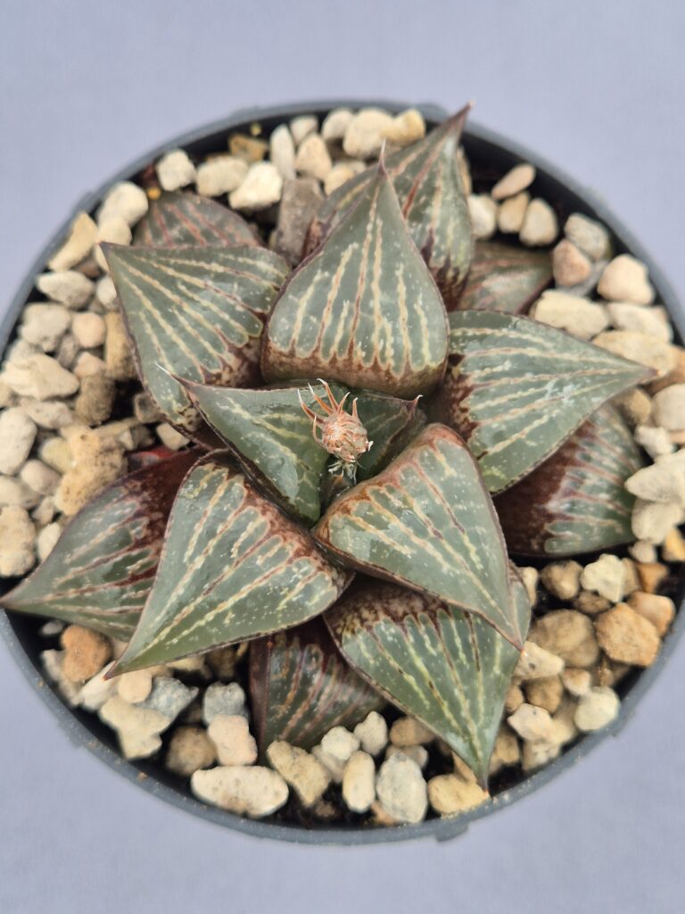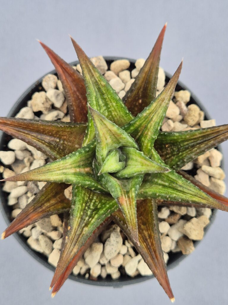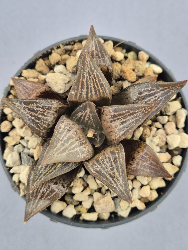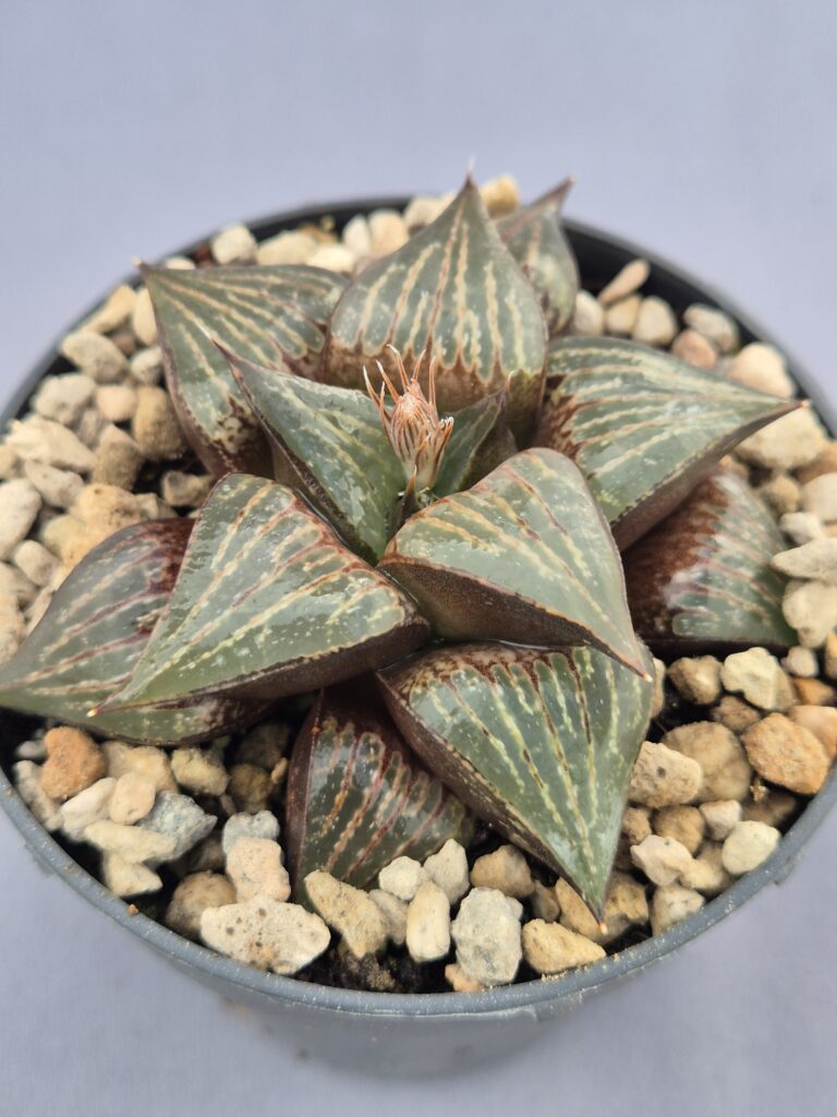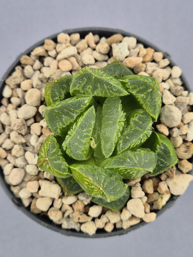 Haworthia híbrida de roseta compacta y elegante, con hojas triangulares y ligeramente translúcidas que muestran vetas claras muy características. Una planta resistente, ornamental y perfecta tanto para coleccionistas como para principiantes.