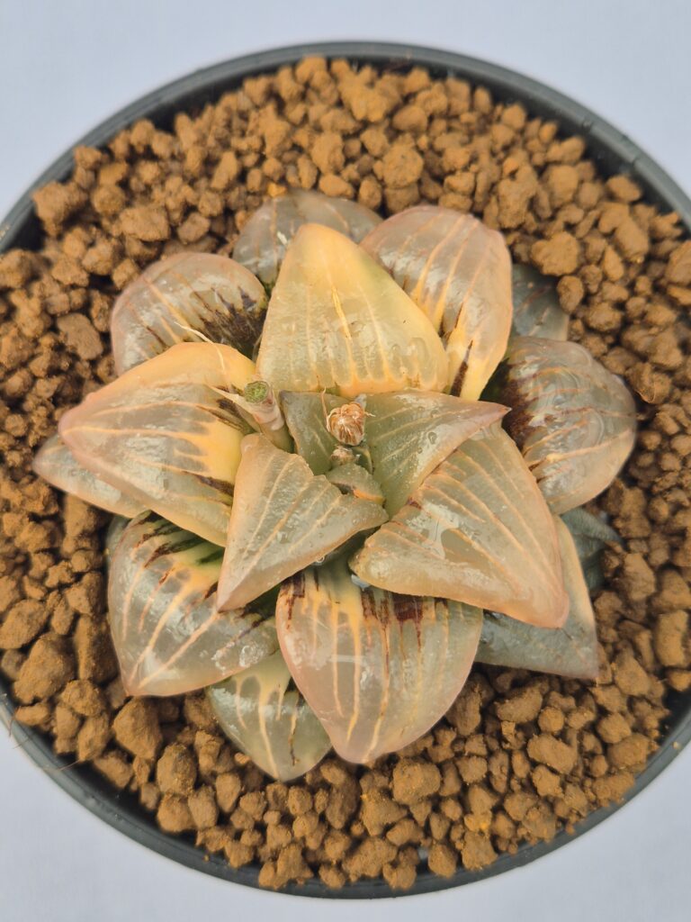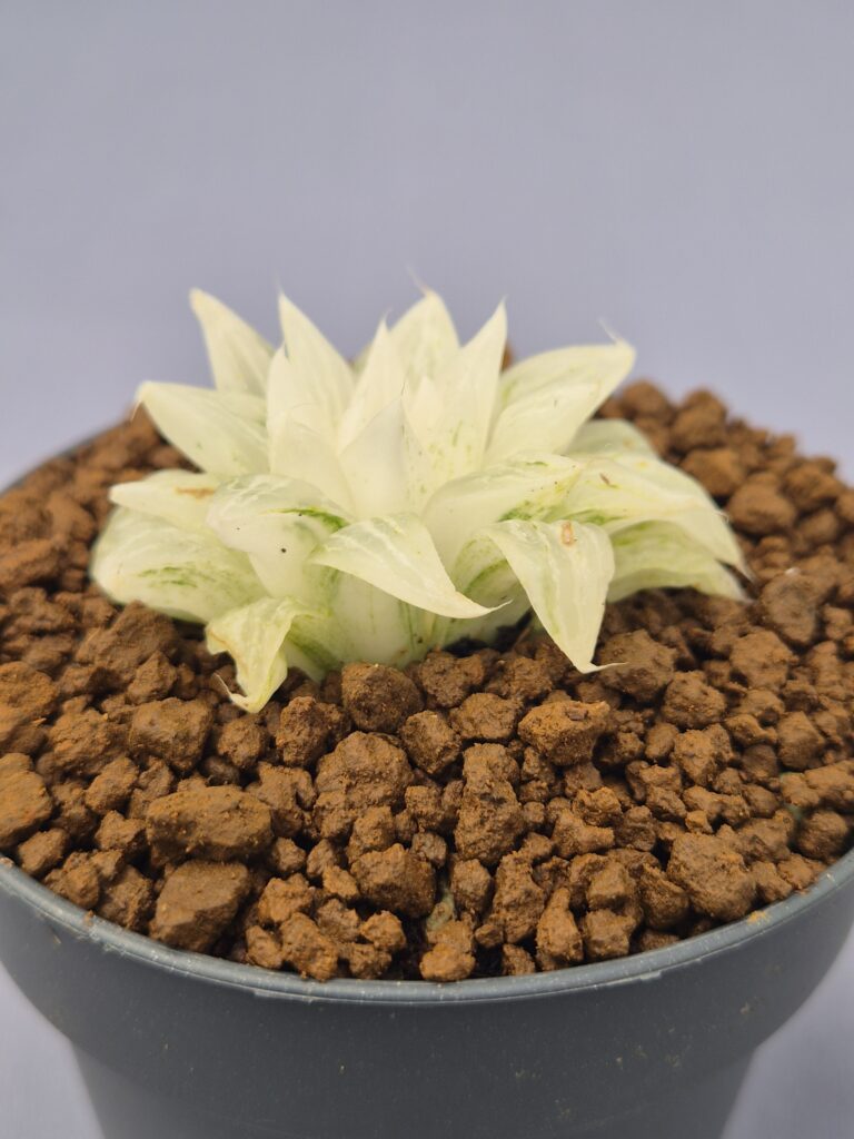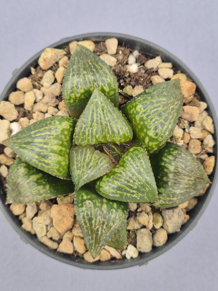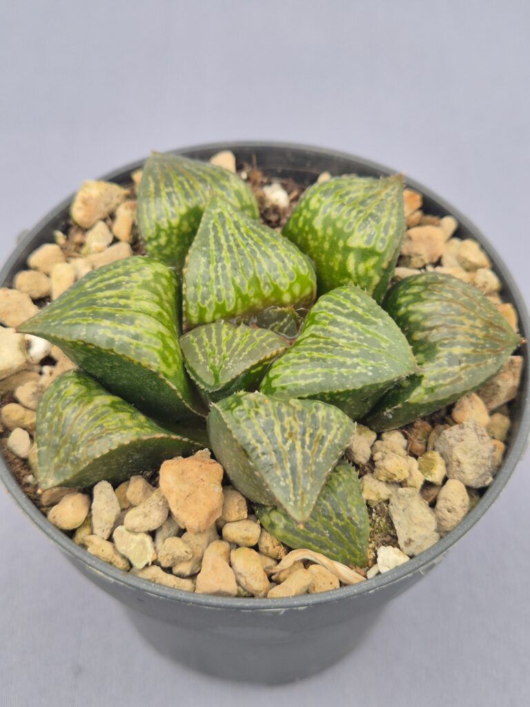 Esta Haworthia destaca por su porte compacto y sus hojas de un verde intenso y brillante, con ventanales translúcidos y bordes finamente texturados. Una planta resistente y muy decorativa, perfecta para colecciones y espacios luminosos.