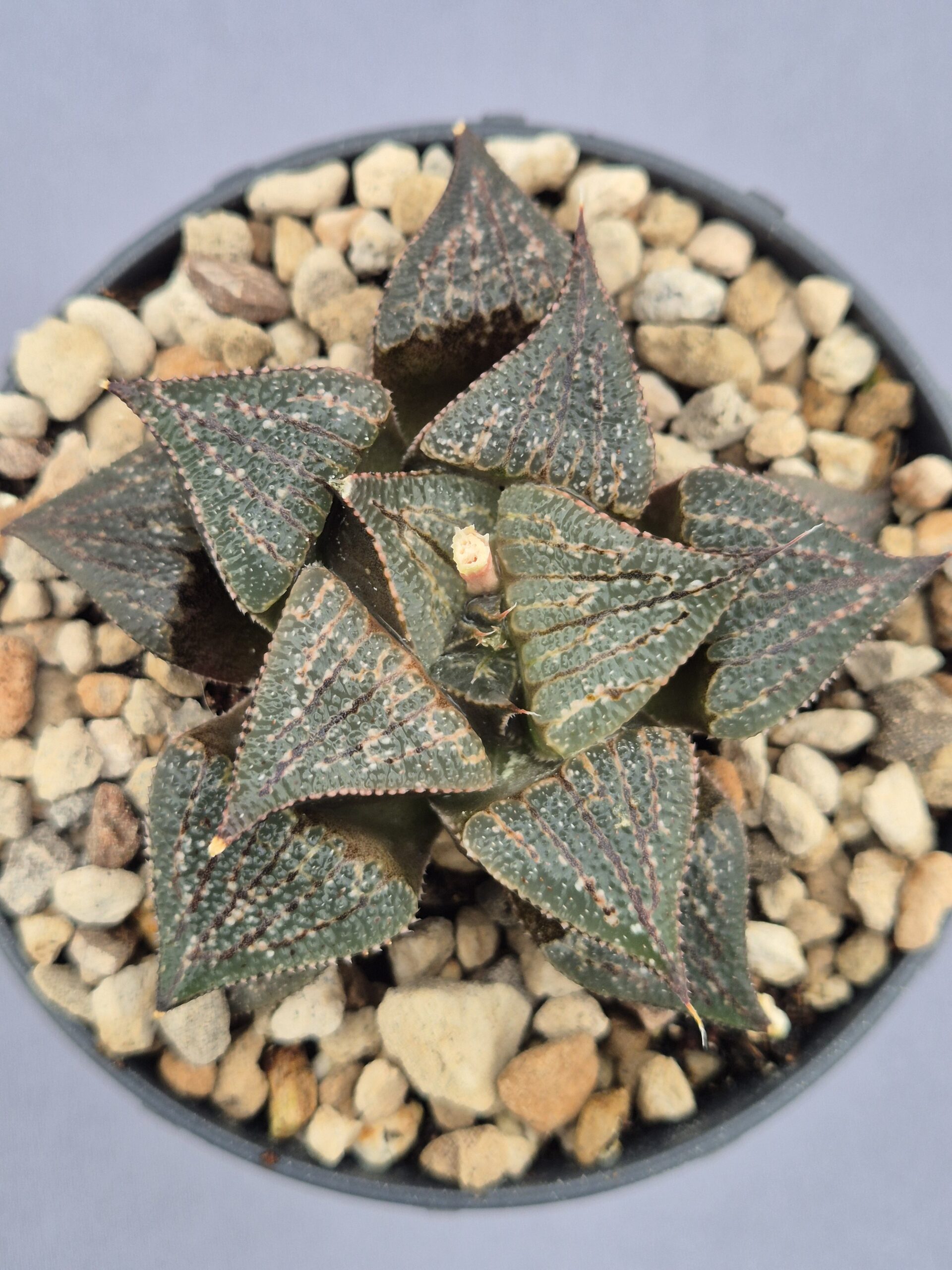 Esta Haworthia híbrida presenta una roseta compacta con hojas triangulares y marcadas ventanas translúcidas, mostrando un patrón moteado muy característico que combina tonos verdes y rojizos. Un ejemplar resistente y de crecimiento lento, ideal para colección.
