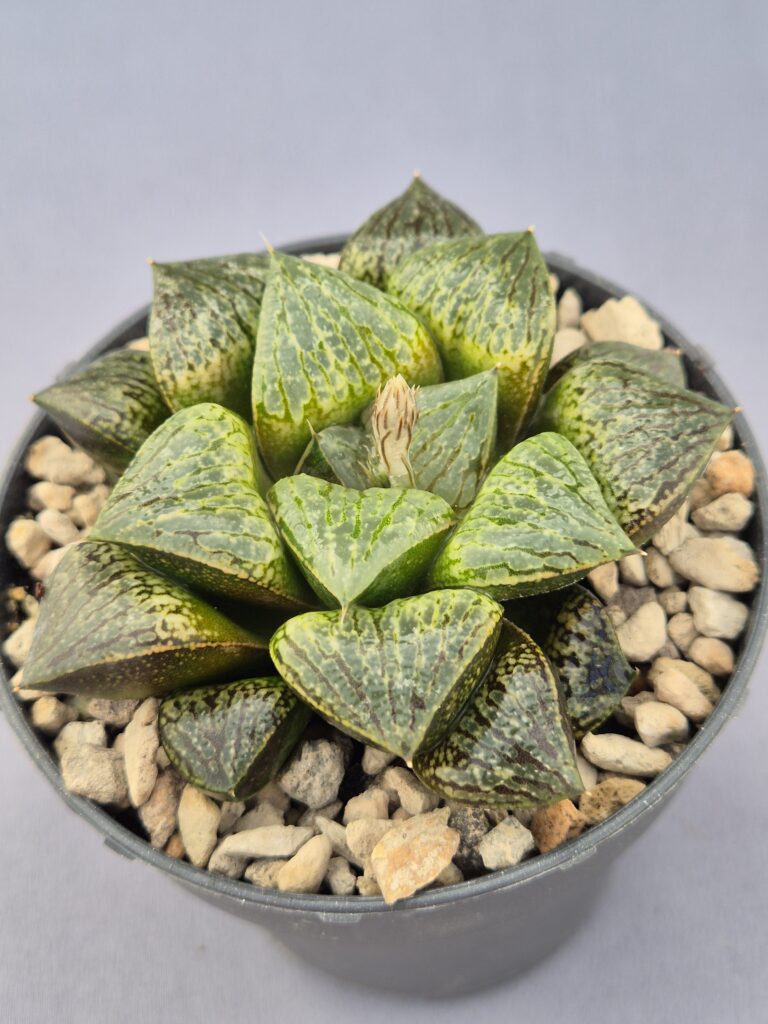 Esta Haworthia híbrida destaca por su patrón moteado y sus hojas triangulares firmes, formando una roseta compacta y muy ornamental.