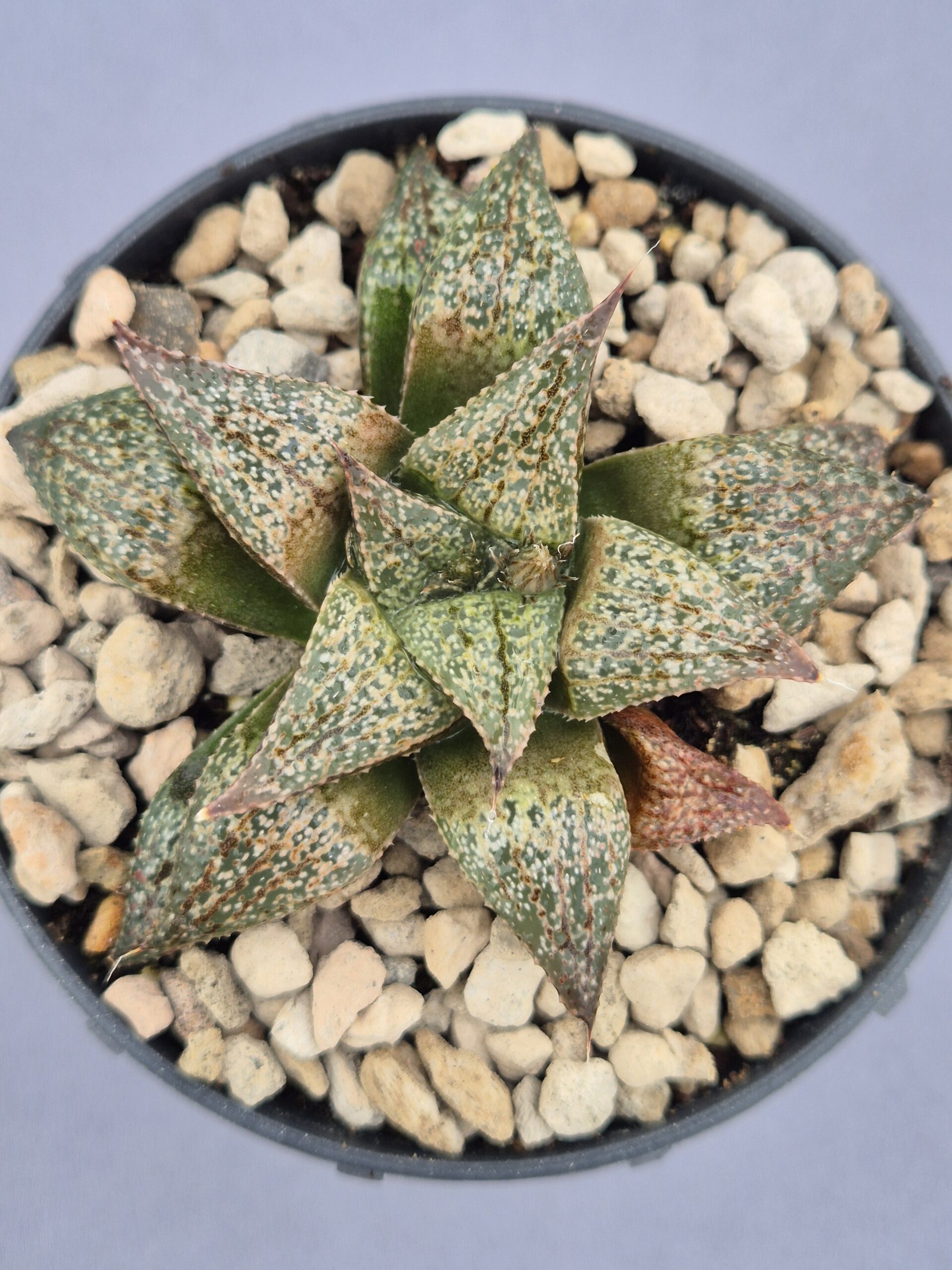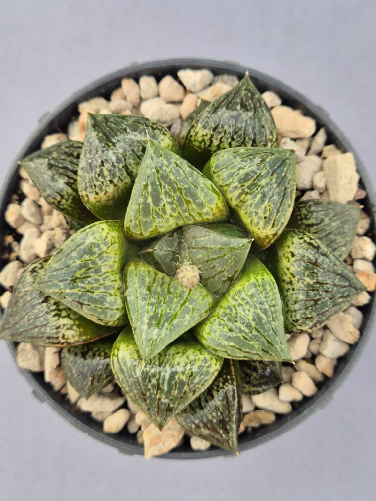 Esta Haworthia híbrida destaca por su patrón moteado y sus hojas triangulares firmes, formando una roseta compacta y muy ornamental.