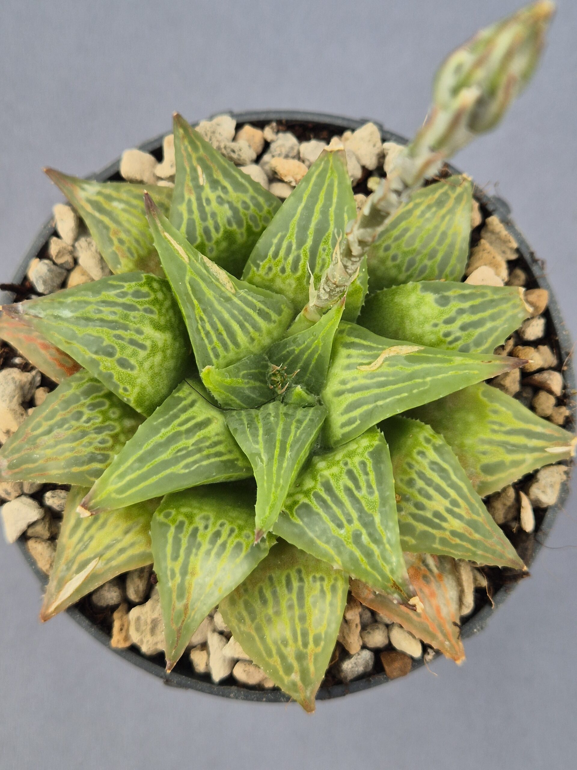Esta Haworthia híbrida presenta una roseta muy definida y simétrica, con hojas translúcidas y marcadas que combinan patrones únicos y tonos verdes intensos. Su apariencia fresca y luminosa la convierte en una pieza especial dentro de cualquier colección.