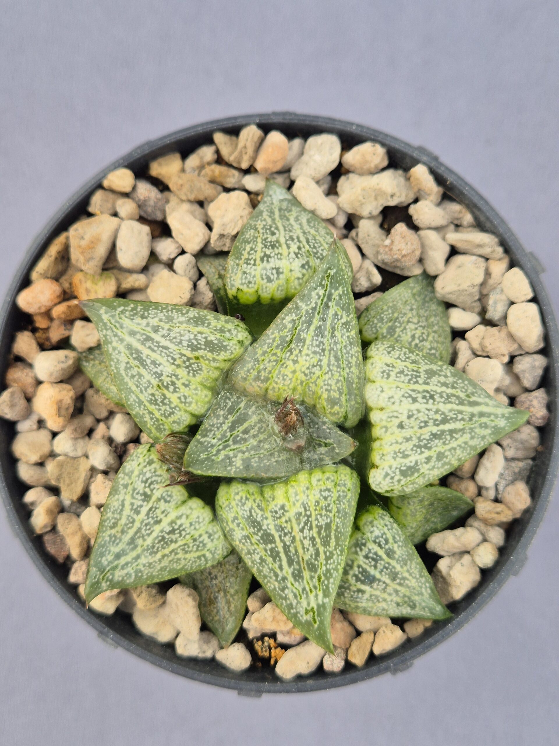 Esta Haworthia híbrida destaca por su roseta compacta y sus hojas triangulares con un patrón moteado muy ornamental. Su apariencia fresca y geométrica la convierte en una planta ideal para coleccionistas amantes de las formas pulidas y bien definidas.