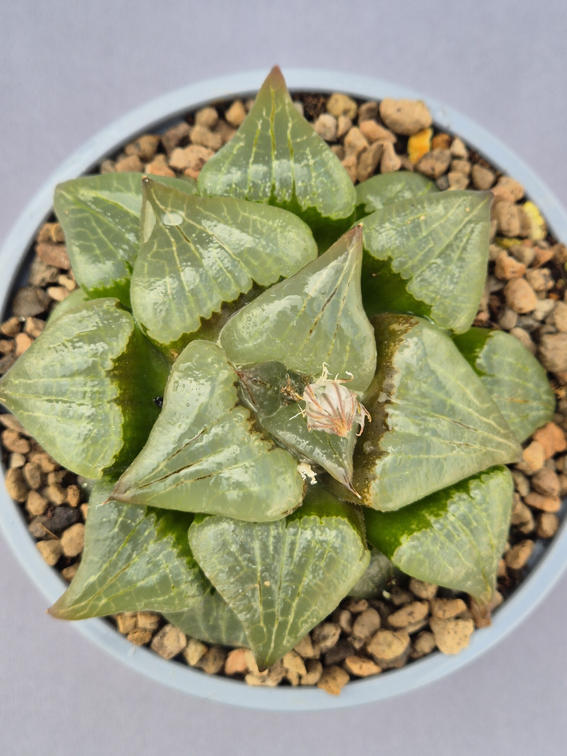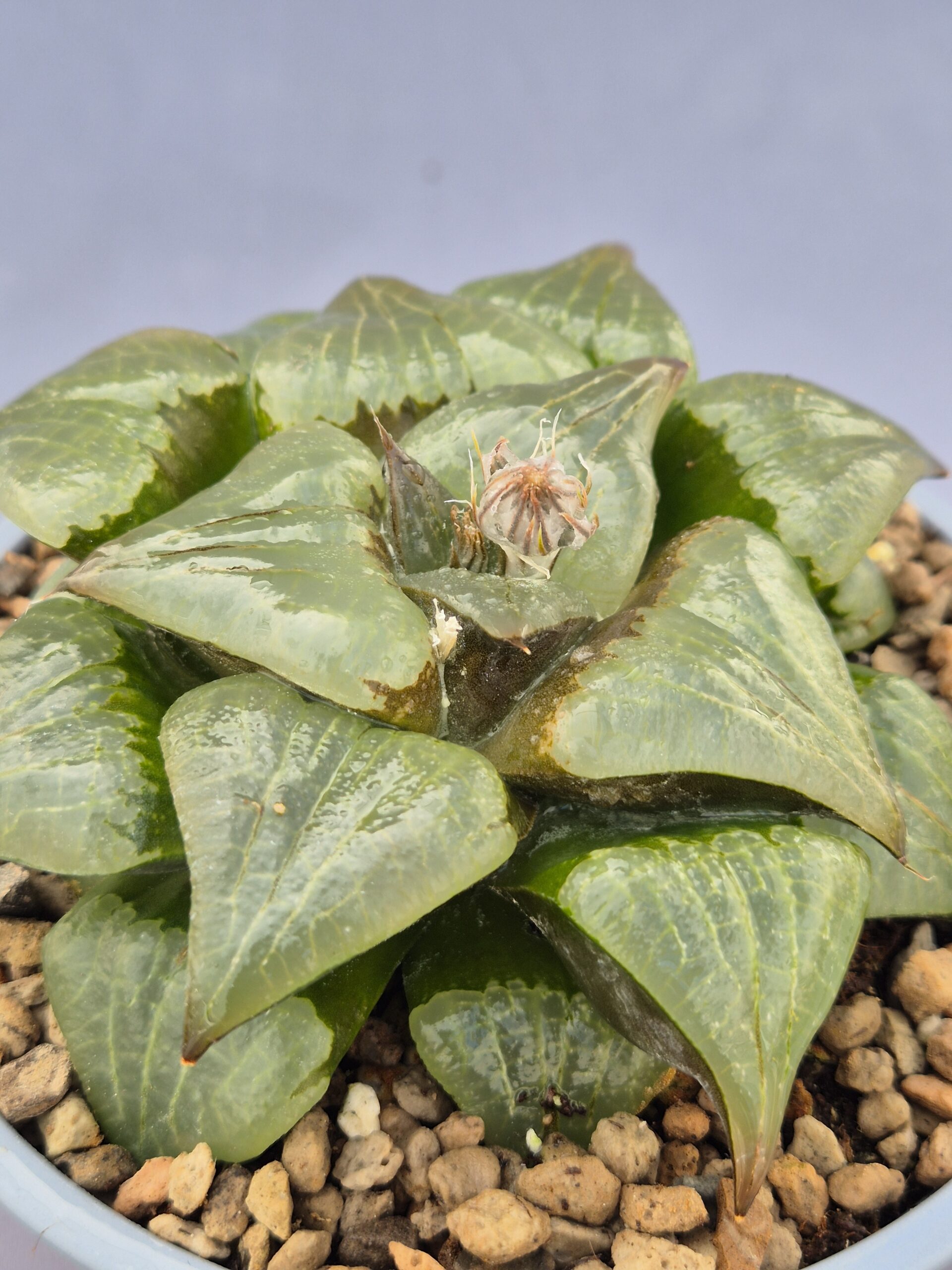 Esta Haworthia híbrida destaca por sus hojas translúcidas y carnosas, formando una roseta compacta que captura la luz de manera espectacular. Es una planta muy apreciada por coleccionistas debido a su belleza, resistencia y facilidad de cultivo.