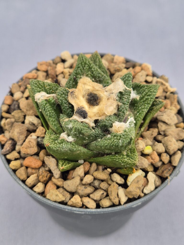 Esta Haworthia híbrida destaca por sus hojas gruesas, triangulares y muy marcadas, con patrones translúcidos y un efecto jaspeado que la hace especialmente atractiva en colecciones de suculentas raras.