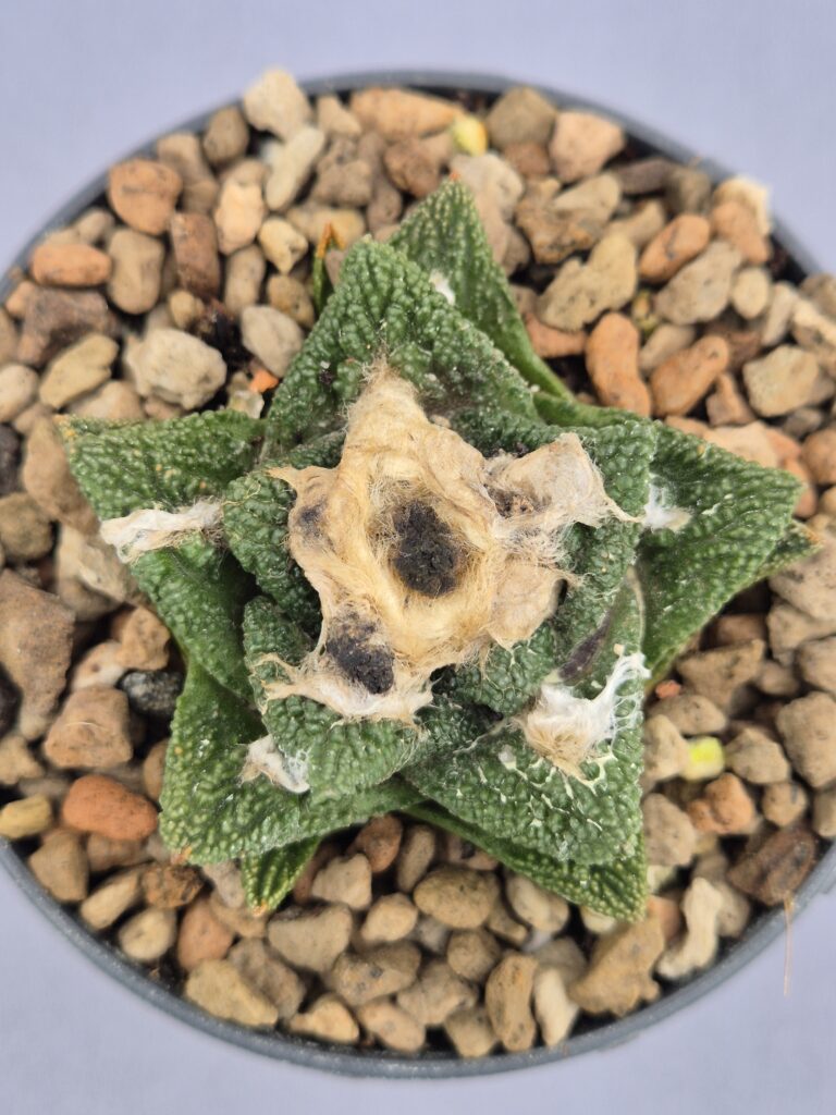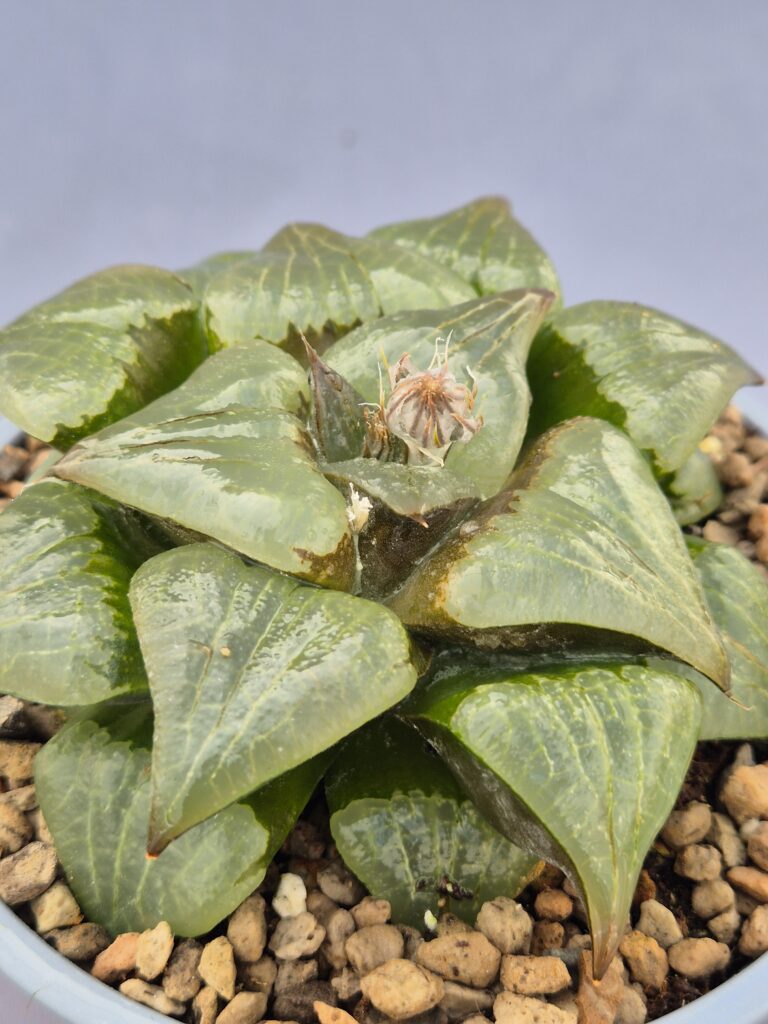Esta Haworthia híbrida destaca por sus hojas gruesas, triangulares y muy marcadas, con patrones translúcidos y un efecto jaspeado que la hace especialmente atractiva en colecciones de suculentas raras.