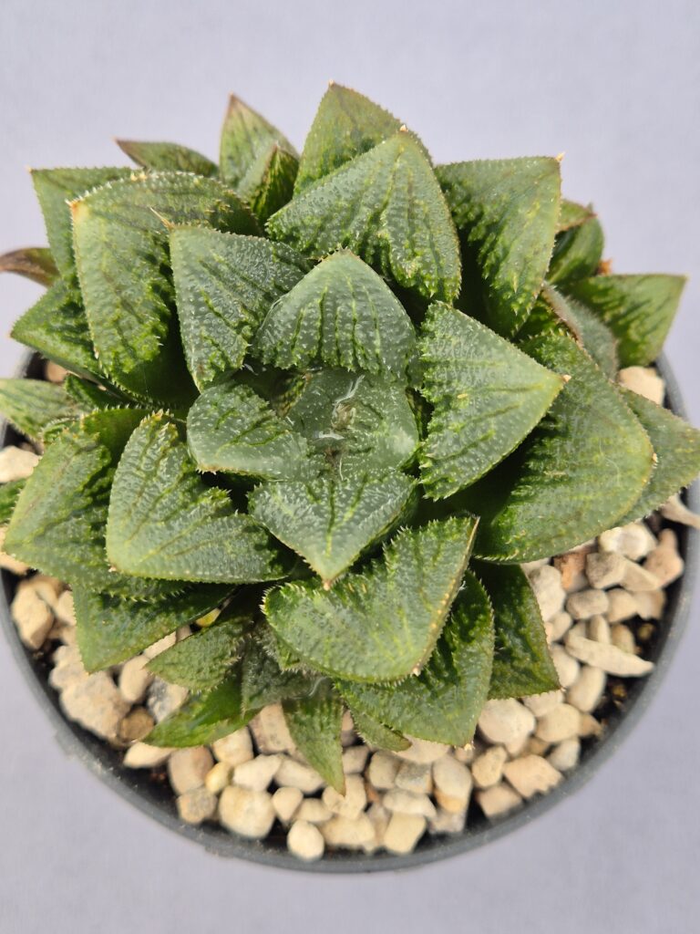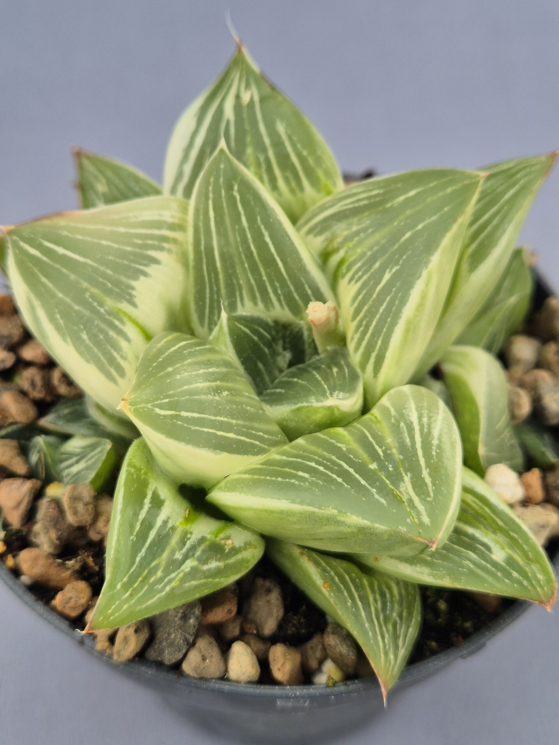 Esta hermosa Haworthia destaca por su atractivo variegado y su forma compacta en roseta. Es una planta muy apreciada por coleccionistas gracias a su apariencia luminosa y elegante.