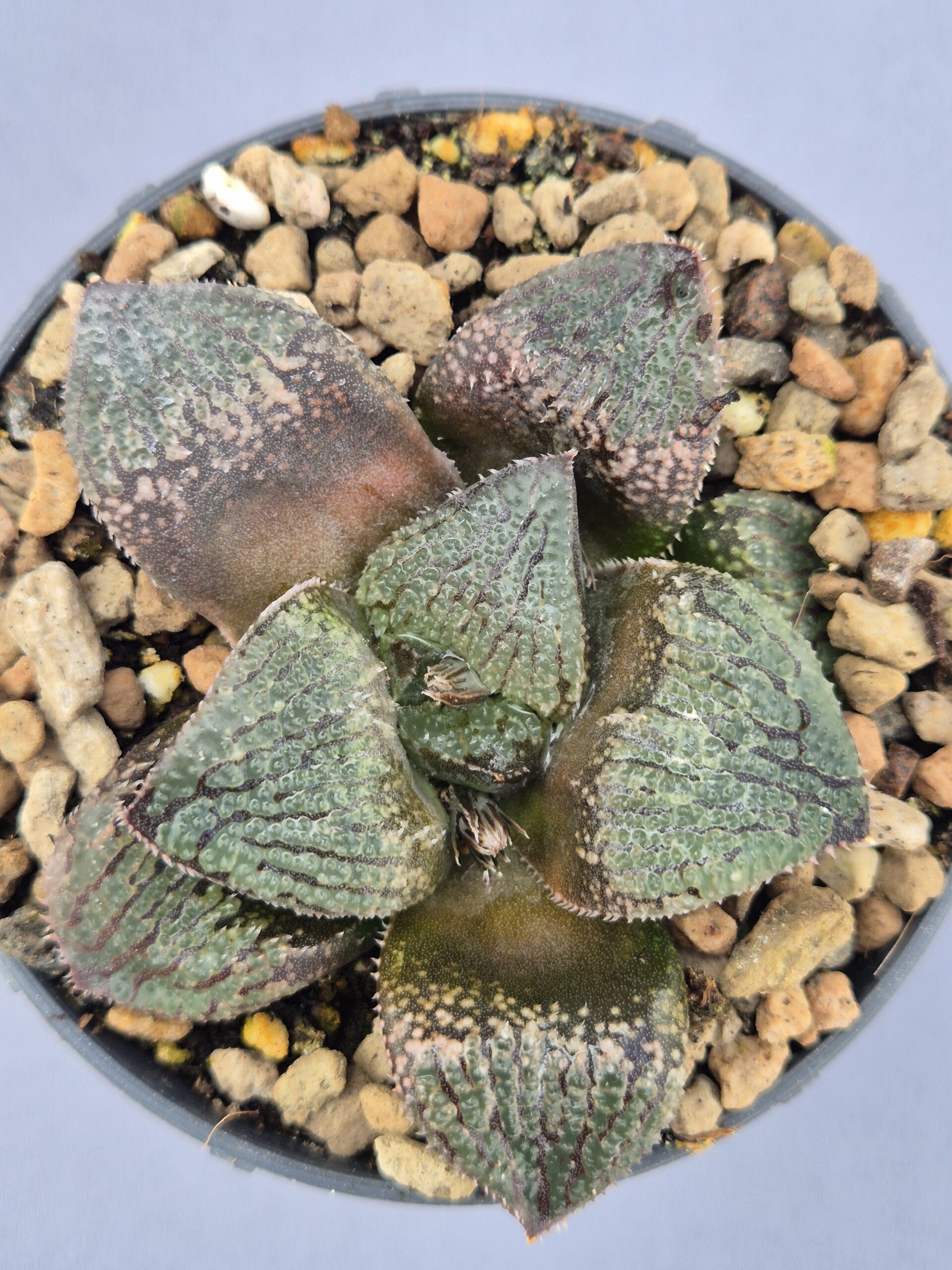 Esta Haworthia destaca por sus tonos oscuros y patrones densos que recuerdan a minerales volcánicos. Es una planta compacta, robusta y de crecimiento lento, ideal para coleccionistas que buscan ejemplares con mucha personalidad.