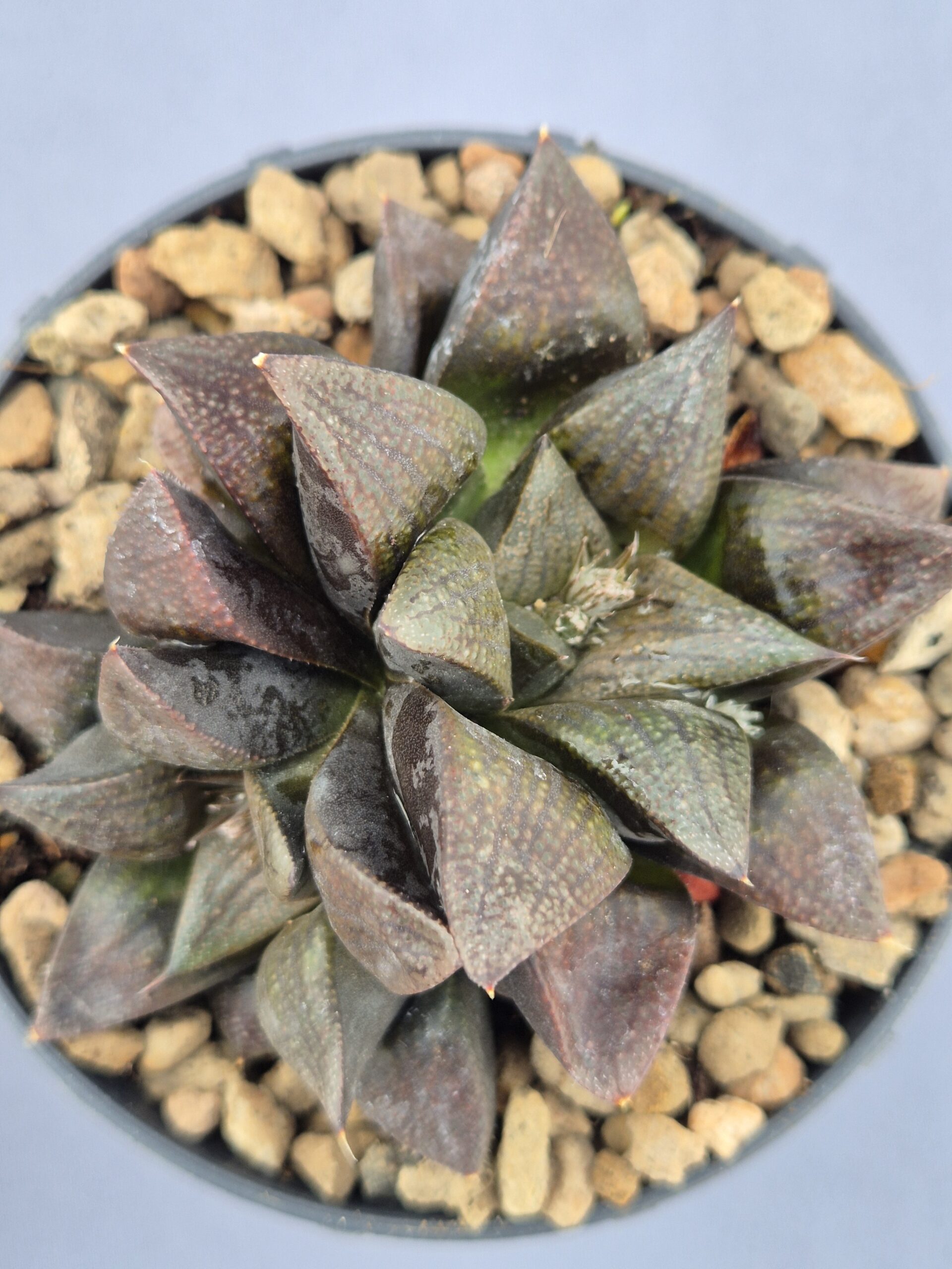 Esta Haworthia híbrida destaca por su tonalidad oscura y matices marrones que se intensifican según la luz y el estrés hídrico. Su porte compacto y sus hojas triangulares con textura marcada la convierten en una pieza atractiva para cualquier colección de suculentas.
