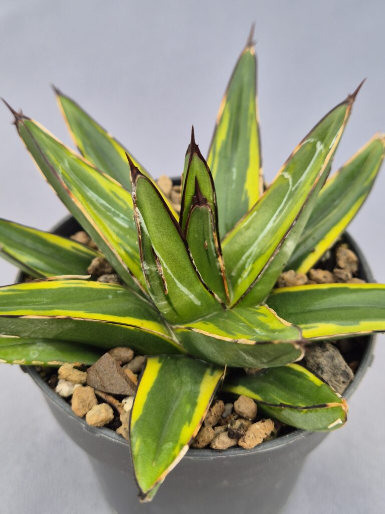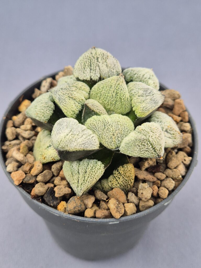 Esta exquisita Haworthia híbrida destaca por sus hojas gruesas, translúcidas y bellamente moteadas, que forman una roseta compacta y muy decorativa. Es una planta resistente, de crecimiento lento y perfecta para coleccionistas que aprecian los detalles únicos en la textura y transparencia de las Haworthias premium.