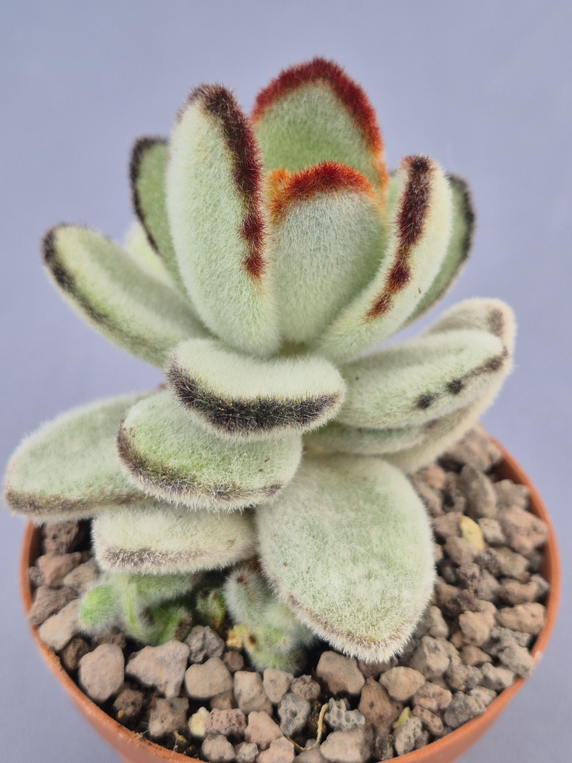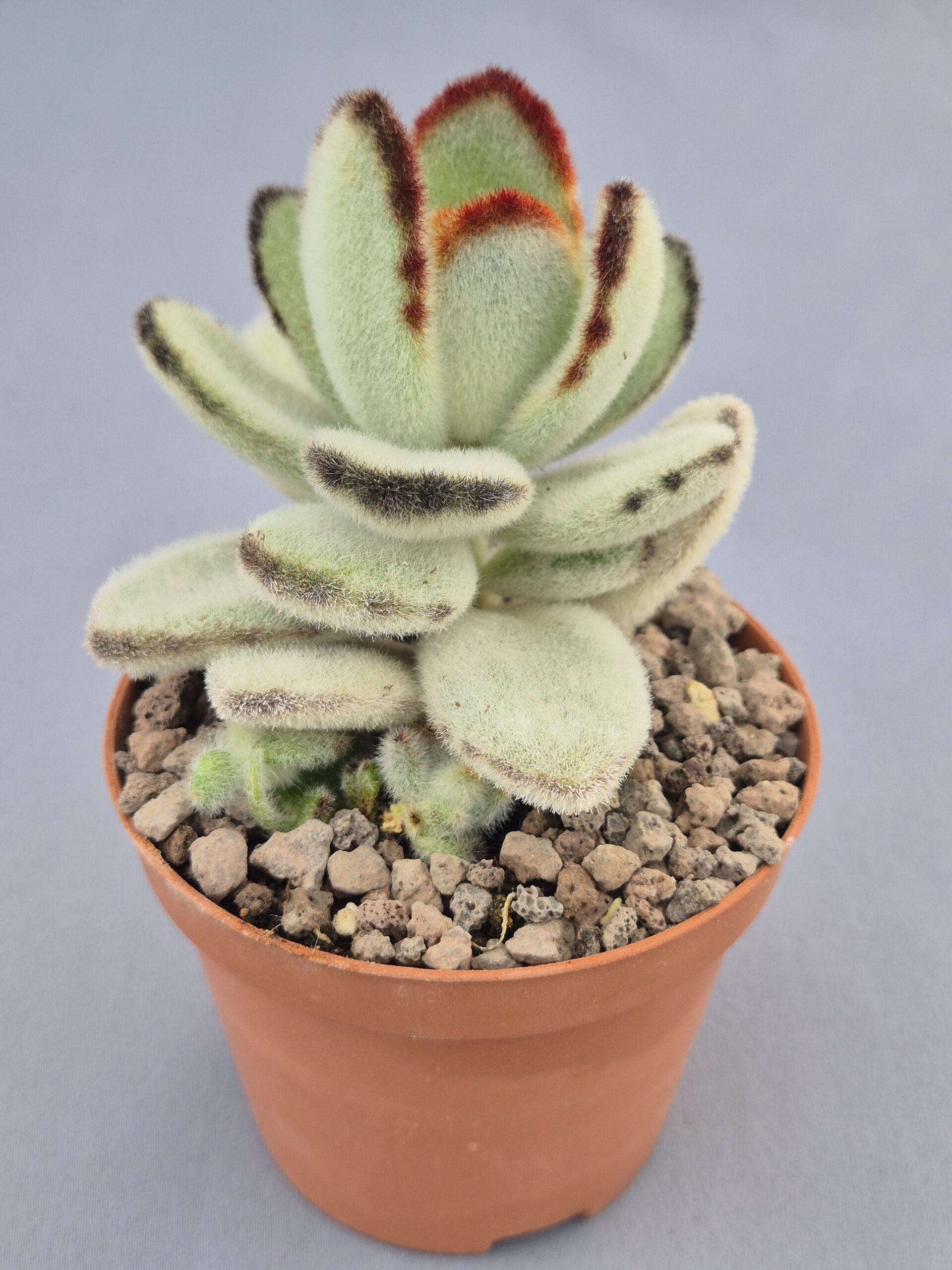 Kalanchoe tomentosa ‘Panda’ es una suculenta muy apreciada por su aspecto aterciopelado y su encanto suave y compacto. Sus hojas cubiertas de finos pelillos y sus característicos bordes oscuros le aportan un aire delicado pero muy decorativo, ideal para colecciones con textura y contraste.