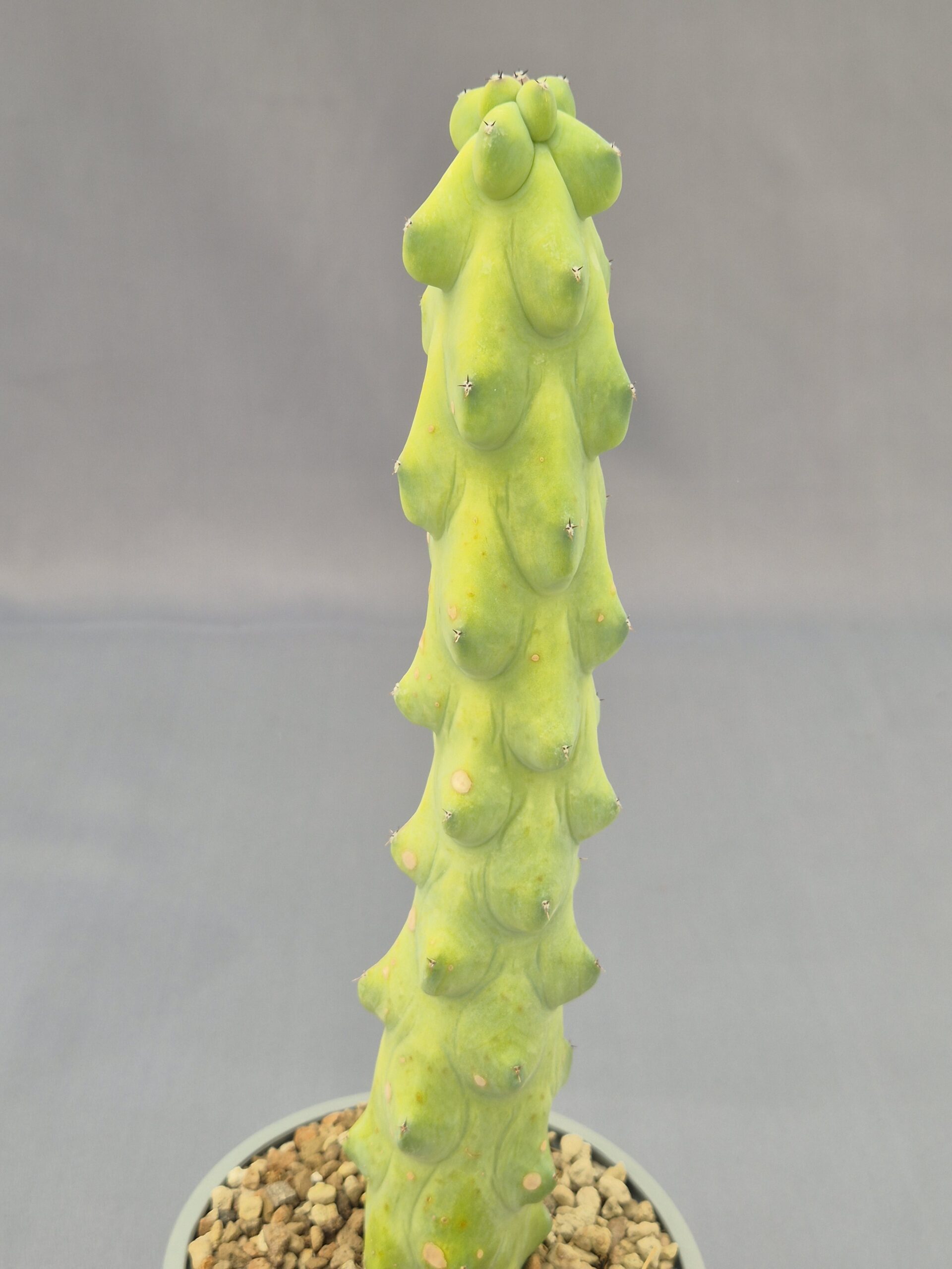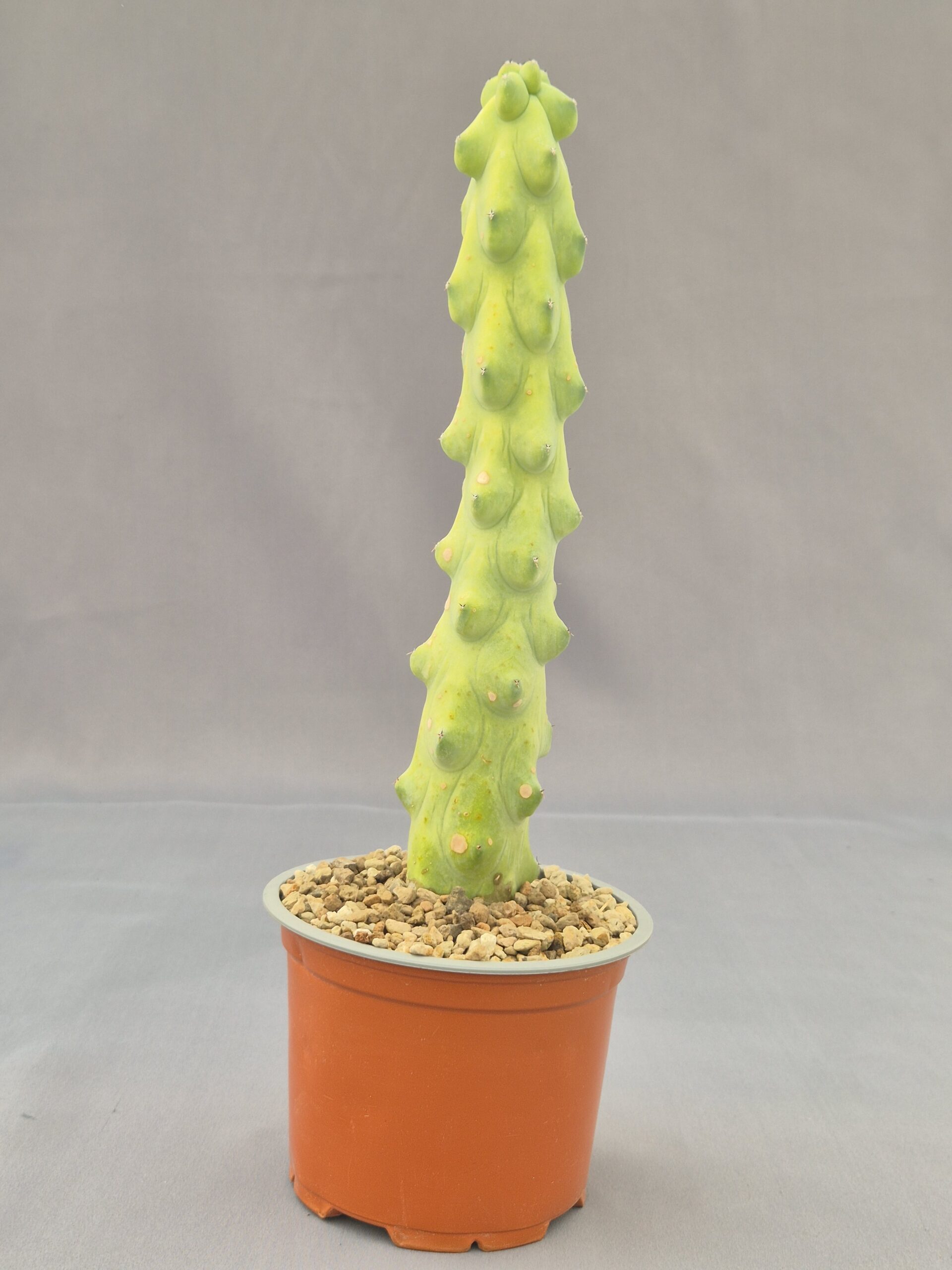 Myrtillocactus geometrizans Fukurokuryuzinboku es una forma monstruosa muy apreciada dentro de los cactus japoneses de colección. Destaca por su crecimiento irregular y abultado, con formas que recuerdan a esculturas vivas. Su desarrollo impredecible y su textura característica lo convierten en una pieza única y muy valorada.
