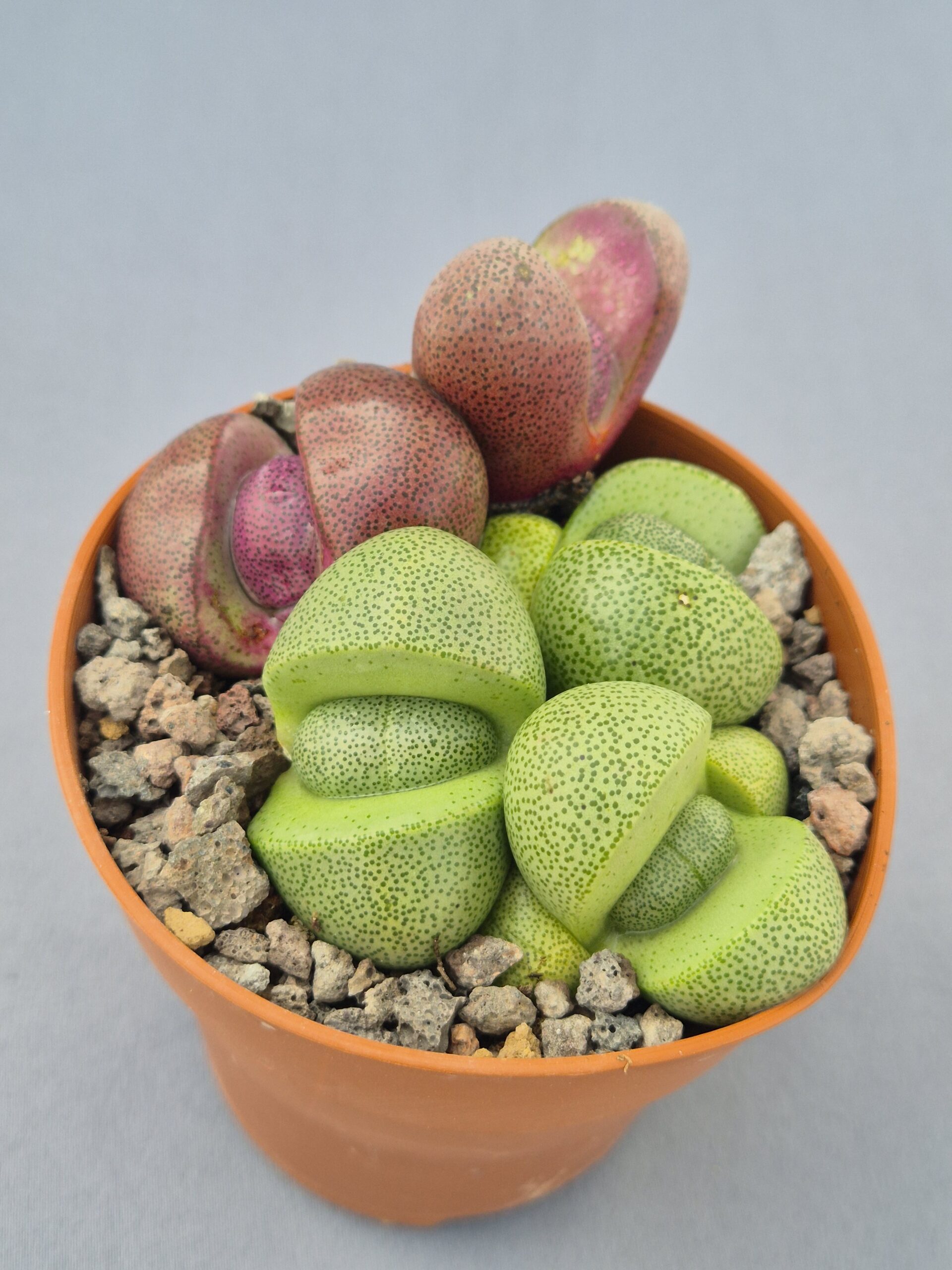 Pleiospilos mix es una composición de suculentas tipo “piedra viva” que reúne distintas tonalidades y estados de coloración dentro del género, creando un conjunto muy decorativo y de aspecto natural.