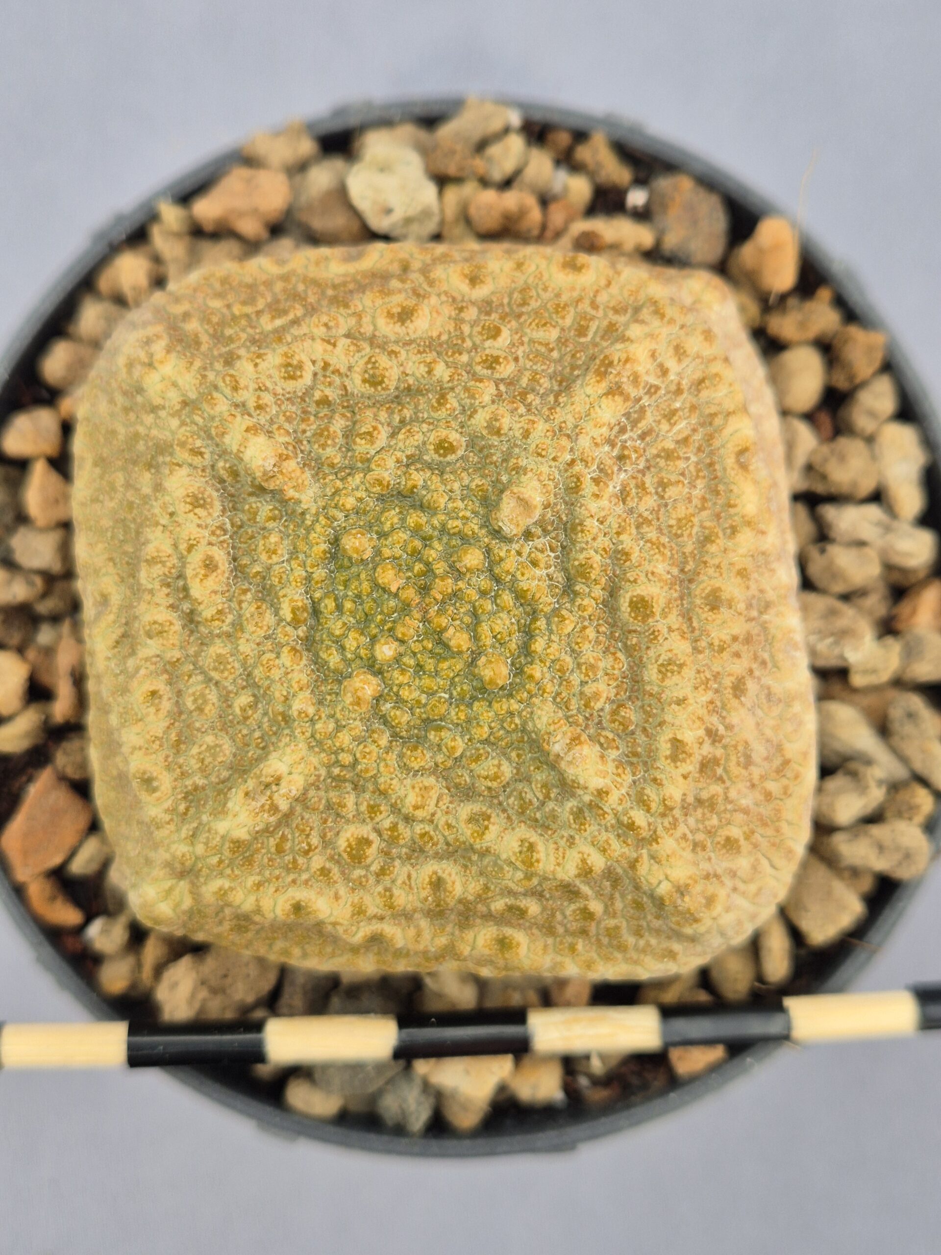 Este Pseudolithos cubiformis presenta una forma perfectamente cúbica y una superficie rugosa llena de pequeñas protuberancias que lo hacen parecer más una roca escultórica que una planta. Su aspecto alienígena, su crecimiento extremadamente lento y su rareza lo convierten en una auténtica joya para coleccionistas avanzados.