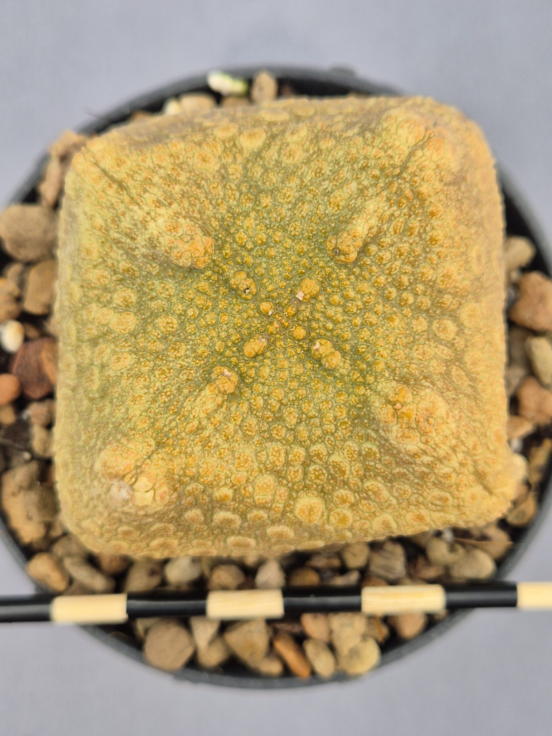 Este Pseudolithos cubiformis muestra una forma perfectamente cúbica y una superficie densa en protuberancias que le aporta un aspecto casi fósil o mineral. Su coloración amarillenta y verdosa, junto con su textura única, lo convierten en una de las suculentas más singulares y escultóricas del género.